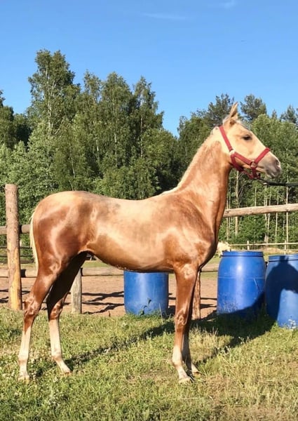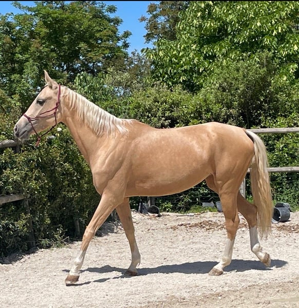 **For Sale: Akhal-Teke Mare** We are pleased to present an extraordinary Akhal-Teke mare, born in 2021. This beautiful palomino horse is a true gem, with a height at the withers of 162 cm. Main features: - Breed: Akhal-Teke - Gender: Mare - Year of birth: 2021 - Color: Palomino - Height at the withers: 162 cm - Discipline: Jumping Our mare has a sweet and affectionate character. She is ready to further develop her skills in jumping, but would also be perfect for other disciplines such as dressage and endurance. Suitable for experienced riders, not for beginners. If you are interested in getting to know this wonderful horse better or would like more information, please do not hesitate to contact us. We will be happy to answer all your questions and arrange a visit! Don't miss the opportunity to have a unique adventure companion with you!
