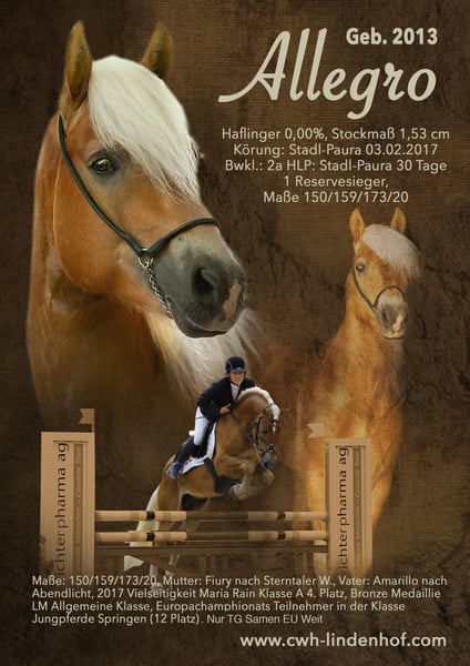30.03.2013 Born. Stock measure 1.51 Grading: Stadl-Paura, 03.02.2017 Bwkl.: 2a HLP: Stadl-Paura 30Days "1st Reserve Winner" Dimensions: 150/159/173/20 Mother: Fiury Father: Amarillo 2017 Versatility Maria Rain Class A 4th place Bronze Medaillie National Championship General Class Europachamphionats participant in the class young horses jumping ( 12th place ) He is an elegant young stallion with sensational pedigree that leaves nothing to be desired! Both parents are represented in the sport of versatility and driving. Drawn from the mare Fiury to Sterntaler-W, Zwkl.: 2a. This can prove numerous successes and has already achieved the title "Landesmeister Springen" several times. She also took part in the world record jumping, the European Championship 2015 (diversity) and many other championships...