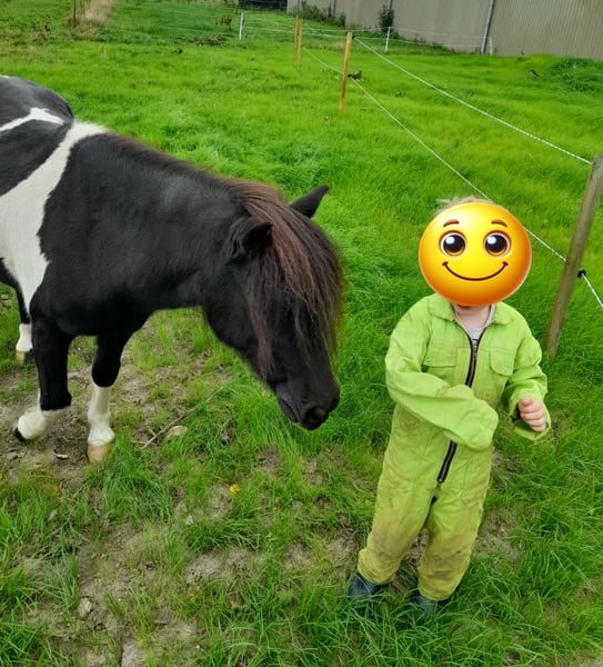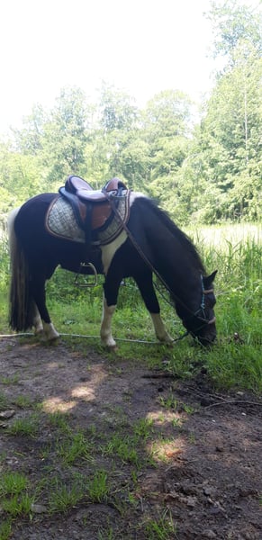 Mon petit coquin mérite une place où il recevra toute l’attention qu’il mérite. Voici Sky, un poney croisé A de 14 ans. Il mesure 1,15 m au garrot. Il partira uniquement vers un foyer définitif, avec la personne qui lui correspond parfaitement. Il a déjà conquis une place dans mon cœur. Maintenant que mon jeune cheval a été monté, je n’ai simplement plus assez de temps pour faire régulièrement des sorties en sulky avec lui. Sky est un poney affectueux, qui aime être près de toi. Lorsqu’il est arrivé chez moi, il souffrait énormément de peur de l’abandon. Heureusement, avec beaucoup de patience, il n’en souffre plus aujourd’hui. Bien sûr, il hennit quand il est seul, mais il ne tire plus sur la corde XD. Il est vraiment un regardé. Un beau hongre pie noir avec une longue crinière et un œil à moitié fermé, à gauche. Il adore manger, ce qui lui donne parfois un petit ventre, haha. Ce qu’il préfère ? Surtout les câlins. Le travail à pied et la conduite en sulky. Cependant, il a ses particularités. Il n’a pas toujours eu une vie facile, donc il y a des jours où il reste immobile sans faire un pas ou où il peut donner un coup de sabot. Mais d’autres jours, il marche très bien en sulky. Il préfère partir avec d’autres chevaux, car il peut être un peu inquiet seul. Si quelqu’un marche devant lui, c’est parfait, et quand il a une bonne journée, il peut aussi partir seul. Quand Sky est arrivé chez moi, il était extrêmement méfiant et avait peur des fouets, mais on ne voit plus rien de cela aujourd’hui. Il ne supportait pas la bride, je suis donc restée en licol sans mors. Je n’ai jamais essayé de travailler avec une bride depuis. Sans mors, il se débrouille très bien. Peut-être que cela pourrait fonctionner à nouveau, mais ce n’était pas nécessaire pour moi. Il n’est pas facilement effrayé. Les véhicules agricoles lourds, les voitures qui passent rapidement, ce n’est pas un problème. Mais s’il ne se sent pas bien dans sa peau, il peut tout utiliser pour s’effrayer si cela lui tombe dessus. Il est dressé, mais sous la selle, il peut être lunatique. Il préfère travailler en liberté ou en travail à pied. Il adore sauter par-dessus des obstacles. Monter en paddock, juste pour le plaisir, il trouve ça super. Il est aussi à l’aise avec de jeunes enfants, ce qui montre qu’il est très sociable. Par contre, il n’aime pas trop la compétition de vitesse. IL N’EST PAS ADAPTÉ AUX DÉBUTANTS ! Il convient uniquement à un cavalier expérimenté, capable de le gérer avec douceur mais fermeté. Sky est chez moi depuis 2015. Je l’ai vu évoluer d’un jeune cheval anxieux et incertain vers un poney qui profite de la vie. Il se sent bien et aime jouer le rôle du macho dans le groupe. Ce n’est pas un poney ordinaire, il est unique. Parfois, on a envie de le coller au mur, et d’autres fois, on ne peut s’empêcher de rire aux éclats à son sujet. Sky cherche un propriétaire qui accepte que chaque jour avec lui soit différent. Qui lui offrira un foyer chaleureux, avec un groupe avec lequel il pourra trouver sa place. Il a besoin de compagnie équine pour partir en balade. Lorsqu’il sent que nous allons en forêt, il devient plus rapide, ce qu’il adore. Je souhaite lui offrir un foyer définitif où il recevra plus d’attention que je ne peux lui en donner actuellement. C’est un véritable amour. Ce n’est pas juste qu’il soit toujours la dernière option. Mais il est heureux ici, il s’amuse aussi très bien dans le paddock ou lors des petites sorties en sulky, donc il n’a pas forcément besoin de partir. Il vit actuellement en plein air, c’est là qu’il s’épanouit le mieux, bien sûr avec un abri et un groupe qui aime aussi jouer dehors avec lui. Parce qu’il aime aussi jouer. Est-ce que cela te fait sourire en lisant cela ? Tu es toujours le bienvenu pour venir le voir et lui faire des câlins. Peut-être que Sky est le poney qu’il te faut. Il est toujours à jour dans ses vaccinations, vermifugé si nécessaire, et a été chez le maréchal-ferrant. C’est un poney en bonne santé et en forme, avec peut-être un peu trop de graisse en ce moment (a). Il est aussi possible de reprendre son équipement (selle, bridon + harnais de sulky) ainsi que la sulky.