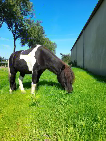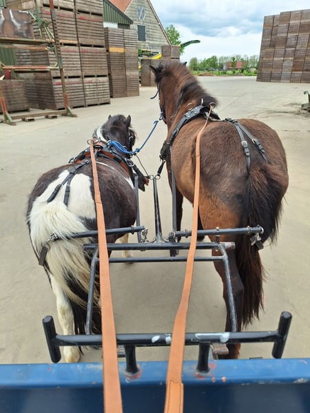 Mijn kleine ondeugd verdiend een plekje waar hij weer de volle aandacht krijgt. Ontmoet Sky, een 14 jarige kruising A pony. Hij is 1,15 m hoog. Hij gaat enkel weg naar een forever home, met de perfecte match. Hij heeft al een plekje in mijn hart heeft veroverd. Nu dat mijn jonge paard is ingereden, heb ik gewoon te weinig tijd om ook nog met hem regelmatig met de sulky weg te gaan. Sky is een aanhankelijke pony, die graag bij je is. Toen hij bij mij kwam had hij heel erg verlatingsangst. Gelukkig met veel geduld, heeft hij daar nu geen last meer van. Natuurlijk hij hinnikt wel als hij alleen is, maar de draden blijven nu heel XD . Hij is een echte eyecatcher. Een mooie zwart bonte ruin met lange manen en een half maanoog, links. Hij houdt van eten dus hij heeft wel regelmatig een buikje, haha. Wat hij het leukste vind? Vooral lekker knuffelen. Grondwerk en voor de sulky. Al heeft meneer een gebruiksaanwijzing. Hij heeft het niet altijd even goed gehad in zijn leven, dus er zitten soms ook dagen tussen dat hij blijft staan en geen stap meer zet of bokt hij. De andere dagen loopt hij dan weer hartstikke leuk voor de sulky. Het liefste gaat hij met andere paarden op pad, hij kan alleen wat onzeker zijn. Als er iemand voor loopt is het prima en als hij zijn dag heeft, kan hij ook wel eens alleen op pad. Toen Sky bij mij kwam was hij enorm kopschuw en bang voor zwepen, daar merk je nu niets meer van. Hij kon geen bit verdragen, dus ben ik met hem bitloos verder gegaan. Ik heb het ook nooit meer geprobeerd om met een bitje te werken. Zonder gaat ook prima. Misschien kan dat wel weer inmiddels, maar voor mij was het niet nodig. Hij is niet snel bang. Grote landbouwvoertuigen, snel langs rijdende auto’s etc. is geen probleem, maar als hij niet lekker in zijn vel zit kan hij wel alles gebruiken om van te schrikken als hem dat uitkomt. Hij is ook beleerd, maar onder het zadel is hij wispelturig. Hij loopt liever voor de sulky of grondwerk. Vrij springen vind hij helemaal geweldig. Erop zitten in de wei, gewoon voor de gezelligheid. Vind hij ook prima, dan is hij met kleine kinderen erop vertrouwd. Van het fanatiek rijden is hij minder gecharmeerd. NIET GESCHIKT VOOR BEGINNERS! Alleen voor een zekere ruiter, die hem durft aan te pakken op een liefdevolle maar duidelijke manier. Sky is sinds 2015 bij mij. Ik heb hem zien uitgroeien van een angstig en onzeker jong paardje, naar een pony die geniet van het leven. Die zich goed voelt en graag de macho van de kudde is. Hij is niet zomaar een pony, hij is uniek. Soms kun je hem wel achter het behang plakken en soms kun je enorm hard om hem lachen. Sky zoekt een baasje die er tegen kan dat geen dag hetzelfde is met hem. Die hem een warm thuis kan geven, met een kudde waar hij zijn plekje in kan vinden. Hij heeft andere paarden om hem heen nodig, waarmee hij op pad mag. Wanneer hij merkt dat we naar het bos gaan, gaat hij harder lopen. Daar geniet hij zichtbaar van. Ik gun hem zo een forever home waar hij meer aandacht krijgt, dan wat ik hem op het moment geef. Het is namelijk een echte lieverd. Het is voor hem niet eerlijk altijd laatste keuze te zijn. Maar goed hij is gelukkig hier en vermaakt zich ook prima in de weide en de rondjes met de sulky, dus hij hoeft niet perse weg. Hij staat nu altijd buiten, daar gedijd hij het beste bij. Uiteraard met een schuilmogelijkheid en een kudde die ook gezellig buiten met hem wil spelen. Want spelen doet hij ook graag. Ga jij glimlachen als je dit leest? Je mag altijd een keertje komen kijken en met hem knuffelen. Wie weet is Sky wel de pony voor jou. Hij is altijd op tijd ingeënt, ontwormt(wanneer nodig) en naar de hoefsmid geweest. Het is een gezonde en fitte pony, met nu wel iets te veel vetjes misschien (a). Er is een mogelijkheid om zijn tuig(zadel&hoofdstel+sulky tuig) en de sulky ook over te nemen.