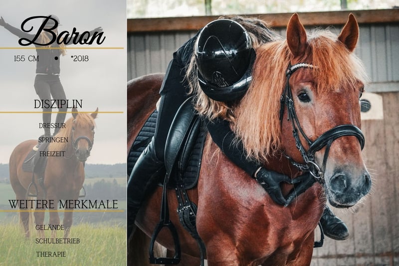 Baron is a 7-year-old gelding, approximately 155 cm tall. *Baron* dream horse - beautiful and super cool. Riding him gives you a safe and good feeling, making him suitable for nervous riders, children, and therapy. He is unfazed by unfamiliar environments, fast traffic, tarpaulins, desensitization training, and even show exercises. Baron is stunning with a great and strong build without being bulky. He is very calm, so restless legs, etc., are not a problem for him. He is simply a dream horse. Don’t miss the chance to own such a horse. Horse Trading Dederichs – Your partner for buying horses. Contact & Availability: Please inquire exclusively by phone at 0173/9792139. Monday – Friday: 09:00 – 18:00 Saturday: 09:00 – 15:00 Sunday: Closed Follow us on Social Media! Experience our daily life with the sales horses on Instagram, TikTok & Facebook under Pferdehandlung Dederichs. Discount: Receive a discount of 5%–10% if you take your new dream horse home immediately. Trial Riding & Presentation: • Trial riding: €30 per horse (max. 2 riders), amount will be credited upon purchase • Holidays: Trial ride €50 • Presentation by our trainers: €25 per horse (flatwork, groundwork, etc.) Pre-Purchase Examination & Transport: • Many of our horses already have a pre-purchase examination • You are welcome to bring your own veterinarian • We can gladly organize an examination • We are also happy to assist you with transport to the new home. Other Sales Horses: We have more sales horses in our stable that are not yet online. If your dream horse is not listed, please do not hesitate to contact us. Important Notes: • Height measurements are estimated and not precisely measured. • All descriptions are subjective assessments by the seller and do not guarantee specific qualities. For more information, please visit: www.Pferdehandlung-Dederichs.de
