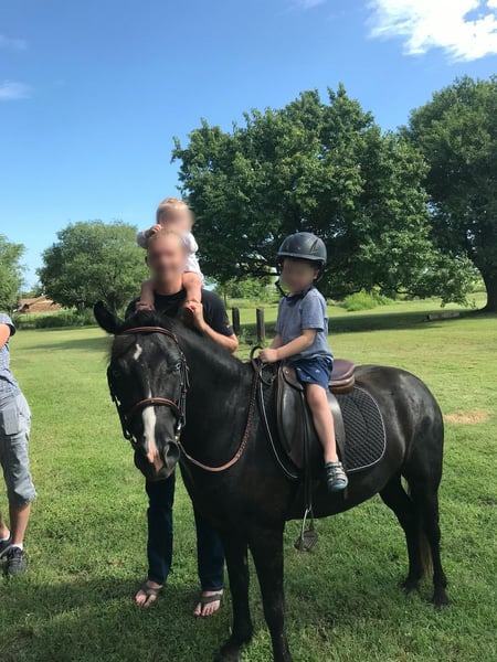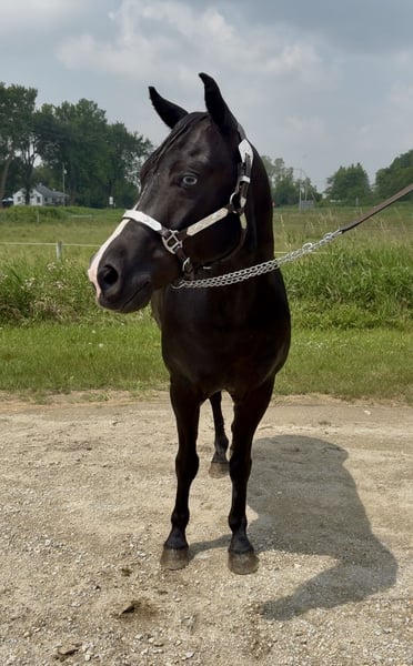 "AVAILABLE ON ONLINE HORSE AUCTION AT www DOT MagicHorseAuction DOT com BIDDING OPEN NOW thru TUESDAY | AUGUST 19TH! - BUY IT NOW AVAILABLE! *Final price will be determined on auction site* CONSIGNOR CONTACT INFO: Melissa Montgomery 918-409-7484 LOCATION: Rochester, MN "Ollie is a cute, cute, cute 7 year old black pony with blue eyes. He stands 11.3-12 hands and is sound in every way. Dubbed “the cutest thing I’ve ever seen” at every show he’s been to, he will catch the judge’s eye every time. He has been brought along slowly from age three by small adult riders, but we put a little kid on him regularly. We have been super careful not to overwork him in his training; we’ve chosen to bring him up, teach him something, maybe go to a local show and then turn him back out for some months. He’s been in professional training for the hunter ring and he never refused a jump. He’s also comfortable in the english and western dressage arenas and he’s done a little bit of cross country jumping and trail riding. Plus, he was broke to drive by a professional trainer and has driven cross country! He would excel with a young person who’s got a little bit of experience, but he’s also cantered the grandchildren(age 7)around on the lunge line. He’s been back in training for the grandchildren for the last three months and now he’s sadly offered for sale because Daddy is still in school and Mommy is expecting their third baby! We can’t fault Ollie in any way except that he does not get treats from the hand (or he won’t leave you alone), and he needs reasonable fly control in his stable to control biting flies. He loads, clips and stands for the farrier. His dental care and vaccinations are up to date.