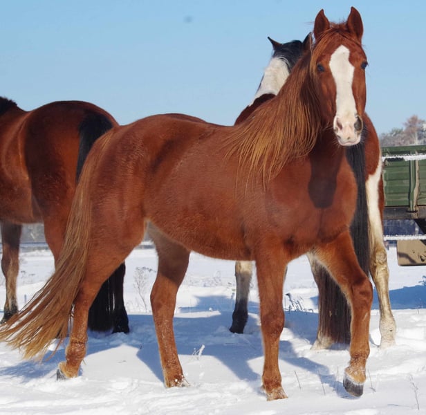 Devlyn is such a friendly horse that it is hard to put into words. She does everything for her person and enjoys every form of attention. Although we haven't properly trained her yet, we have already taken her on a few rides. The first time we took her out was because she really wanted to join us. We saddled her up, led her a few steps with the saddle, lured her to the mounting block with a treat, got on and off three times, and then rode her out as a lead horse. We crossed a stream and returned. That was about two kilometers, and she was absolutely sweet and cooperative. There is a video of this on our Instagram. You have to scroll a bit to find it; it was on January 16th. Devlyn is an exceptional character, for whom humans are the most important thing. Our horses are only sold to homes where they have the opportunity to move freely with other horses 24 hours a day. It is important to us to have enough space for each horse to gallop in the paddock even in winter, sufficient feeding places for the number of planned horses, appropriate companionship around the clock, and a shelter that provides soft lying areas and weather protection at all times of the year. Additionally, it is important to us that our horses continue to be adequately dewormed several times a year and receive immunization against tetanus. When you contact us, we will ask you for pictures of your horse keeping arrangements to see if the appropriate conditions are met for the respective horse. This way, we ensure that our horses remain friendly, engaged, and healthy partners for you in the future. Sustainable horse sales are a matter close to our hearts.