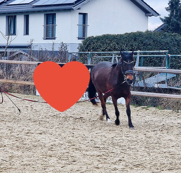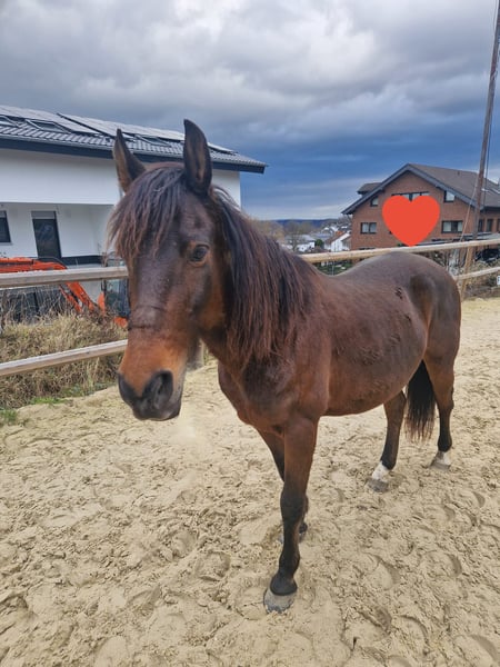 In unserer Elly steckt ein ganz tolles Pony - es benötigt allerdings etwas Zeit und Vertrauen dies herauszukitzeln, denn sie sagt erstmal zu allem nein, ist unsicher und fremde Menschen sind erst recht blöd. Gibt man ihr genügend Zeit, Sicherheit und konsequent Regeln vor, ist sie gut zu händeln - auch von erfahrenen älteren Kindern. Sie ist sehr lernwillig bei der Bodenarbeit, beim reiten sehr fein an den Hilfen. Sie bringt bei beidem etwas "go" mit. Im Gelände zeigt sie sich mit viel Routine entspannt - nur vor LKW's, Treckern oder großen Anhängern hat sie Angst, das kann man aber sicherlich sehr gut mit ihr üben. Elly ist sehr rangniedrig und kennt 24/7 draußen sein, sowie Nachts Box. Beim Hufschmied zeigte sie sich bisher immer brav und kooperativ und auch das verladen und Fahren zu uns ging ohne Probleme. Sie ist ungefähr 10 Jahre alt und 1,40m groß Leider müssen wir der süßen einen neuen Platz suchen, da sie durch den Reiterwechsel in der Reitpädagogik massiv gestresst ist. Ein Handycap bringt sie leider noch zusätzlich mit: als wir Elly im Sommer 2025 übernommen haben, teilte uns unser Hufschmied mit, dass sie wohl 2024 mal Hufrehe hatte - uns wurde leider dazu nichts mitgeteilt. Bei der Vorbesitzerin stand sie ganztägig auf der Wiese, bei uns vorsichtshalber nur stundenweise und hat angepasstes Futter bekommen. Bei Interesse freue ich mich auf eine Nachricht, weitere Videos auf Anfrage