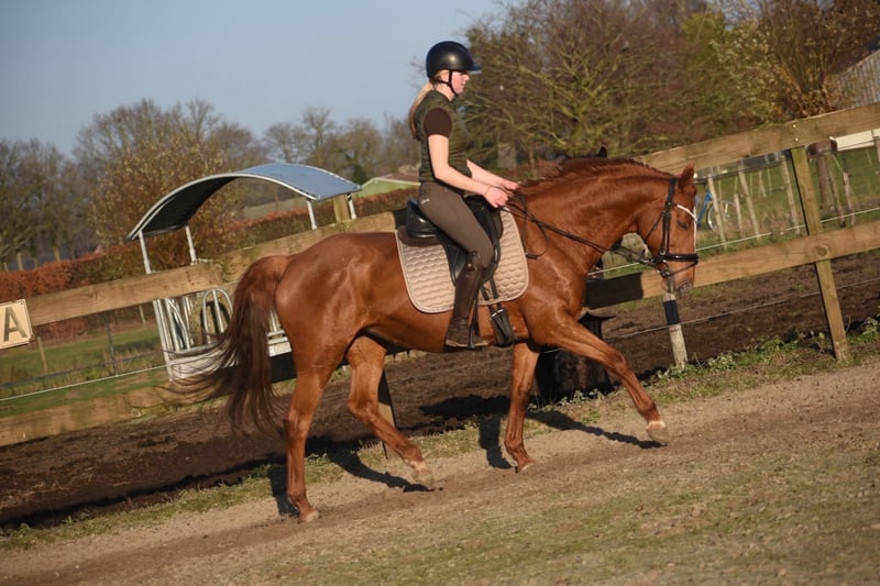 Prachtige, beginnersproove , ervaren rijpaardmerrie Dana is werkelijk een plaatje. Ze heeft een prachtige goudvoskleur , een mooie bouw en aansprekend hoofdje. Haar vorige baasjes reden voornamlijk buiten met haar. Toch reed ze hier vanaf het begin super netjes in de bak. Ze is geboren in 2007 maar ziet er super uit, en je zou haar deze leeftijd beslist niet geven. Maar de ervaring heeft ze, om een beginner veilig op pad te helpen en /of iemand die gewoon een makkelijk paard op prijs stelt. Dana is ca 160 m hoog. Ze heeft een goede stamboom van Dow Jones Courcel ( App) X Shardari x Little Credit. Kan dus best dat er een stippel uit komt als je nog een veulentje bij haar krijgt. Wist je dat paarden tot op hoge leeftijd een veulen kunnen krijgen? Ze hebben geen menopauze zoals wij mensen. In ieder geval is Dana een perfecte vriendin. Lief, sociaal, makkelijk, trailer en verkeersmak bij ons en voorheen. 3950,- incl. merkzadel en compleet hoofdstel