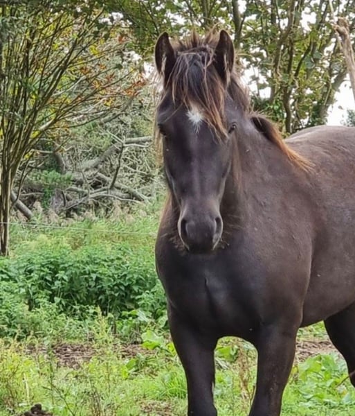 🦄 Jument Irish Cob PP noire - bientôt 5 ans (07/2026) - âme sensible & coeur immense 🌏Visible actuellement à Quéménéven. Possibilité de rester à la pension après achat (carrière et chemins de balades) Environ 1m40, porteuse. Plein papier, père Irish Cob IRL élite, très belle lignée maternelle (San Cler, mère et grand-mère isabelle → beaux poulains possibles). 📸Photos des parents sur demande 💫Très bonnes bases en travail à pied (pro) : déplacements, cessions, désensibilisation (bâche, drapeau, véhicules…). 💫Débourrage en cours avec professionnelle : monte au montoir sans bouger, 3 allures (galop en perfectionnement), arrêt d’urgence, directions. Elle est très fine aux aides (voix, assiette). Sa curiosité fait d'elle une jument volontaire et intelligente. 🌿Sort en extérieur seule, encore sensible émotionnellement → idéal accompagnée au début. Douche OK, van OK, longues rênes connues. Vie au pré H24 en troupeau, n'aime pas le box fermé. Très proche de l’humain, facile à attraper (vient quand on l'appelle). Clôtures solides nécessaires (elle est maligne 😅). À jour maréchal, vaccins, vermifuge, ostéo, dentiste. Pieds nus, RAS santé. (Concernant les fanons, la boue a persisté longtemps par chez moi, même en période estivale, se qui n'aide pas à la repousse. Mais elle a de très bons pieds et n'a jamais fait de gale de boue.) Convient à cavalier expérimenté jeune cheval. Recherche famille ⭐️⭐️⭐️⭐️⭐️ 💰 45🥕🥕 Prix en adéquation avec ses belles origines ainsi que la qualité du travail fait avec elle 📩 Infos et photos sur demande en MP