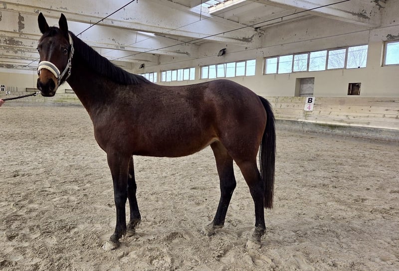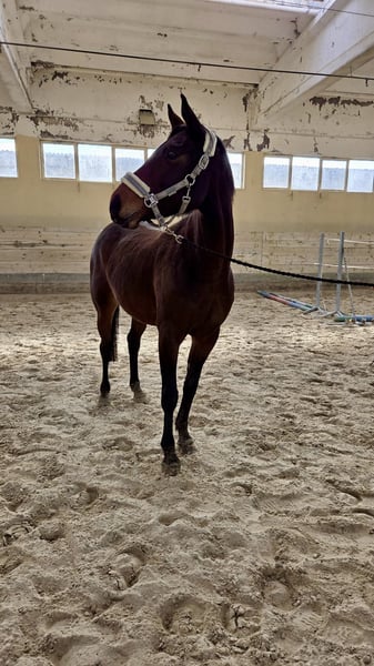 She is of a smaller frame, approximately 163 cm tall, and is currently in the process of being backed and trained under saddle. She has a very good and willing temperament, and with some further work she will make a good sport horse. Vet check✅