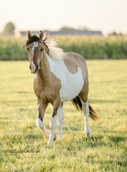 This young man is truly something special to see! He is a beautiful dunskin (3-colored) with dorsal stripe and really beautifully marked. A real eye-catcher. He is looking for a nice, sweet carrot giver. We don't know exactly his parentage. Probably German Riding Pony x Barock pinto x Fjord. We estimate that he will grow to a height of around 1.50 to 1.55m. He knows the most important thing in horse life: the herd ABC. We only breed and do not train, so all our horses are still completely green and not yet used to the halter. The big advantage is that the horses are well socialized in the herd, have not had any bad experiences and you can teach them everything you want. Our horses have and give a lot of confidence and learn quickly. Every year we have approximately 40 beautiful Barock Pinto and Frisian foals for sale from our family stud farm in the Netherlands. And also older horses (0-13 years), all still green and untrained. We breed mostly without Studbookpapers, to keep the horses affordable. You will certainly find your dream horse with us. Our horses grow up very naturally in large herds and are therefore very well socialized. Here they lead a dream horse life: in large meadows in spring and summer. In winter in large group stables. A good character, cool, strong, healthy and sweet are important requirements for us in breeding. You will find us in Tzummarum, near Leeuwarden and we will be happy to meet you. Contact: it is best to call or via Whatsapp.