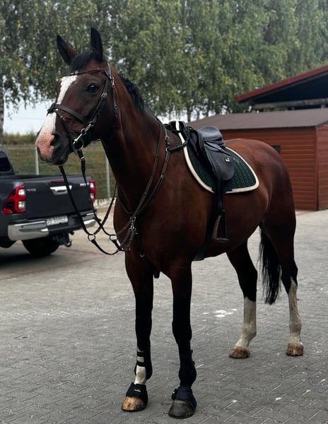 For sale: a beautiful gelding, born in 2009, standing 173 cm at the withers. He is a Hanoverian (note: the breed cannot be selected in the listing) with a bay coat and distinctive markings on his head, belly, and legs. He has excellent jumping potential and is an ideal choice for both experienced riders and those just starting their equestrian journey. He is especially suitable for a younger or less experienced rider — he has been ridden for many years by young girls. The horse is healthy and very well cared for. He is under constant supervision of a physiotherapist, saddle fitter, veterinarian, blacksmith, etc. No issues with his hooves or saddle. He has a “teddy bear” type personality. Despite his age, he is in great shape! Ready to continue competing in show jumping. He has not had any injuries. Possibility of performing a TUV (veterinary examination on-site). He has been trained up to N1 level at home and has previously competed in C-class events. He can be sold with the saddle and/or other equipment! VAT invoice available (€58,000). Please feel free to contact me for additional information or to arrange a free trial ride. This is a unique opportunity to acquire a healthy, safe, and friendly companion for many years!