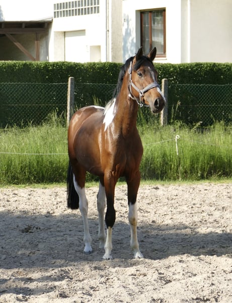 Imperio A, 4-year-old gelding by Insider out of Chaman, a true colorful dream! Excellent movement potential, with a highly interesting pedigree for eventing and show jumping.
