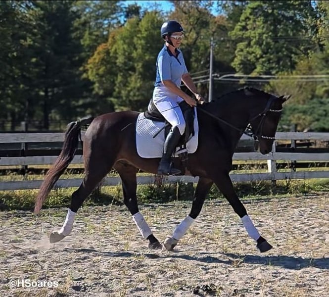 ONLINE-AUKTION Bieten Sie jetzt auf www.PlatinumEquineAuction.com Startgebot: 3.500 US-Dollar Auktionsende: 21. Dezember 2025 Benötigen Sie einen neuen Sattel? Schauen Sie bei White Rock Saddles auf unserer Website oder Facebook vorbei. WAF Black Tie Affair ist ein außergewöhnlich talentierter junger Wallach auf der Suche nach seinem nächsten Partner. Unglaublich liebenswert und talentiert, ist dieser 5-jährige Hengst 1,68 m groß, im Dutch Harness Horse-Register eingetragen und zudem für das KPWN-Register zugelassen. Black Tie hat sich in Springen und Vielseitigkeit hervorgetan, war im Nordosten der USA unterwegs und hat in jeder Disziplin, in der er angetreten ist, Platzierungen erzielt. Derzeit springt er in der Klasse bis 1 m bei Springreitern und ist im Anfänger-Vielseitigkeitssport aktiv. Black Tie zeigt hervorragende Reflexe, beeindruckendes Springvermögen, die passende Vorsicht und einen kämpferischen Geist. Er geht jede Situation mit großem Bewusstsein und starker Arbeitsmoral an. Als Publikumsliebling beweist er eine bemerkenswerte Bereitschaft zu gefallen und zu leisten. Er lässt sich verladen, im Anhänger transportieren, anbinden, baden, beschneiden, lungieren und ist beim Schmied sowie Tierarzt unkompliziert. Er scharrt nicht im Anhänger, tritt nicht und wartet geduldig auf seine Prüfung, auch wenn er alleine ist. Er reist gut und bleibt nachts ruhig in der Box, auch wenn er außer Haus steht. Neben seinen Erfolgen im Springen und der Vielseitigkeit ist Black Tie auch auf dem Trail sehr zuverlässig. Er ist nicht schreckhaft, überquert Brücken, Baumstämme und Wasser, hat keine Angst vor Hunden, Autos oder Fahrrädern. Er reitet alleine sowie in der Gruppe. Sein Vater ist der führende DHH-Hengst Hightanium, was ihm das Pedigree und das Talent verleiht, in jede Richtung zu gehen. Ideal für einen ambitionierten Amateur, der ein junges Pferd mit vielseitigen Perspektiven sucht. Standort: Lebanon, NJ. Für weitere Informationen wenden Sie sich bitte an Hannah Zorn unter 917-821-4140.