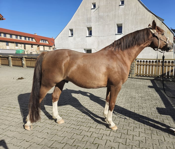 Schön gezeichneter, kleiner Warmblutpferd zum Verkauf. Ca. 155 cm Stockmaß, edler Typ. Mutter: Iskierka Wlkp nach Faust OO Vater: Kaleń Śl. nach Lombard Śl. Geboren 2019. Ich habe ihn gekauft, als er 1,5 Jahre alt war, und seitdem ist er in meiner Obhut. Sein Ausbildungsstand ist als vorerst eingeritten mit Problemen, die noch bearbeitet werden müssen. Er wurde von Anfang an auf die Grundausbildung trainiert. Mit drei Jahren begann die Arbeit mit Sattel und Longe, er nahm den Reiter mit stoischer Ruhe auf, es gab keine Probleme beim ersten Aufsteigen und Reiten. Seit einiger Zeit zeigt er jedoch Schwierigkeiten mit dem Reiter auf dem Rücken, als hätte er Angst davor. Er ist sehr sensibel und freundlich, ruhig bei Pflege und Hufschmied, mag Wasser und Sprühflaschen nicht, aber bei systematischer Arbeit gewöhnt er sich schnell daran. Von seinen Vorfahren hat er die besten Eigenschaften geerbt: kräftige, harmonische Konstitution, gerade, gesunde Beine, starke Hufe, widerstandsfähig gegenüber Witterungseinflüssen, nicht dicker, keine Krankheiten, nie verletzt. Er nutzt jede Futterration sehr gut (was sich in Übergewicht zeigt). Er wird von morgens bis abends in der Herde auf der Weide gehalten, im Sommer auch nachts. Im Herdenverband ist er nicht dominant, lässt sich aber nicht alles gefallen. Geimpft, entwurmt und regelmäßig entwurfsystematisch behandelt. Der Pferd frisst nur nach der Mahlzeit, eine Gastroskopie wurde nicht durchgeführt. Er zeigt keine Schmerzen oder Anzeichen von Magengeschwüren. Es könnte eine Gewohnheit nach dem Fressen sein, da er als 2,5-jähriger Hengst während der Abwesenheit der Stallbesitzerin in einer Box gehalten werden musste. Niederschlesien, Jelenia Góra