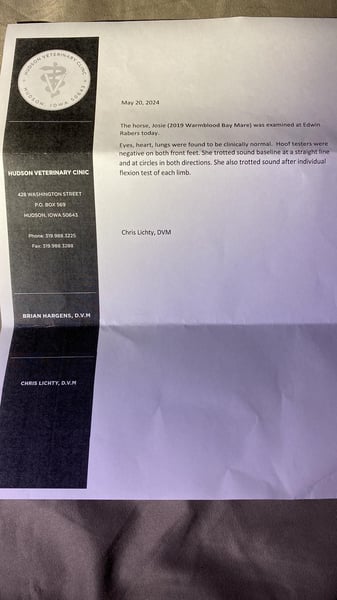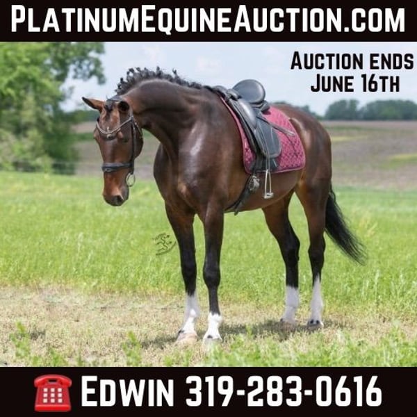 ONLINE AUCTION Place your bids at www.PlatinumEquineAuction.com Starting Bid $3500 Auction ends June 16th, 2024 Need a new saddle? Check out White Rock Saddles on our website or Facebook! DLANABURGA (Josie ) is a 2019 Dutch Warmblood bay mare Registered in the American Dutch Harness Horse Association.She Stands right at 15.3 hands and sure is pretty to look at and to watch her move she will just Float across the ground.If you’re looking for a great dressage prospect with a lot Potential Josie would be the one! She’s had a lot of training in the arena, She has very smooth gaits and loves her job and is willing to do with what you ask, she is doing good on her transitions and had a lot of lateral work done with her as well and has the uphill canter. She is very talented and would do really well in the show ring and could go in high levels! Josie has also been ridden lot outside as you can see and really enjoys being on the trails as well and is Quiet doing it, we’ve taken her through Obstacle course and goes over teeter totter,she goes through water and creeks, she will ride in open fields and Lopes circles nicely, we’ve rode her down fence lines and she just loves being outside. Josie is good being stalled or can be outside as well, easy to catch,she’s good with the farrier,stands for saddling and to mount.Up to date on teeth and dewormer, Josie has very clean legs with absolutely no soundness issues and is very easy to keep and healthy. If you would like more info on this sweet mare please contact Edwin Raber 319-283-0616 Located in Fairbank IA. ONLINE AUCTION Place your bids at www.PlatinumEquineAuction.com Starting Bid $3500 Auction ends June 16th, 2024 Need a new saddle? Check out White Rock Saddles on our website or Facebook!