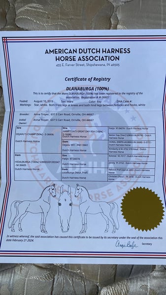 ONLINE VEILING Plaats uw biedingen op www.PlatinumEquineAuction.com Startbod $3500 Veiling eindigt 16 juni 2024 Een nieuw zadel nodig? Bekijk White Rock Saddles op onze website of Facebook! DLANABURGA (Josie) is een 2019 Nederlands Warmbloed bruine merrie Geregistreerd in de American Dutch Harness Horse Association.Ze staat op 15,3 handen en is zeker mooi om naar te kijken en om haar te zien bewegen ze zal gewoon zweven over de grond.Als u op zoek bent naar een grote dressuur vooruitzicht met veel Potentieel Josie zou degene zijn! Ze heeft veel training gehad in de arena, ze heeft zeer soepele gangen en houdt van haar werk en is bereid om te doen wat je vraagt, ze doet het goed op haar overgangen en heeft ook veel lateraal werk gedaan met haar en heeft de bergopwaartse galop. Ze is zeer getalenteerd en zou het heel goed doen in de showring en in hoge niveaus kunnen gaan! Josie is ook veel buiten gereden zoals je kunt zien en ze geniet er echt van om ook op de paden te zijn en doet het rustig aan, we hebben haar meegenomen door hindernisbanen en gaat over de wip, ze gaat door water en kreken, ze rijdt in open velden en loopt mooi cirkels, we hebben haar over hekken gereden en ze vindt het gewoon heerlijk om buiten te zijn. Josie is goed op stal of kan ook buiten staan, ze is makkelijk te vangen, ze is goed met de hoefsmid, staat voor het opzadelen en om op te stijgen.Up to date op tanden en ontworming, Josie heeft zeer schone benen met absoluut geen problemen met de gezondheid en is heel gemakkelijk te houden en gezond. Als u meer informatie wilt over deze lieve merrie, neem dan contact op met Edwin Raber 319-283-0616 Gevestigd in Fairbank IA. ONLINE VEILING Plaats uw bod op www.PlatinumEquineAuction.com Startbod $3500 Veiling eindigt 16 juni 2024 Een nieuw zadel nodig? Bekijk White Rock Saddles op onze website of Facebook!