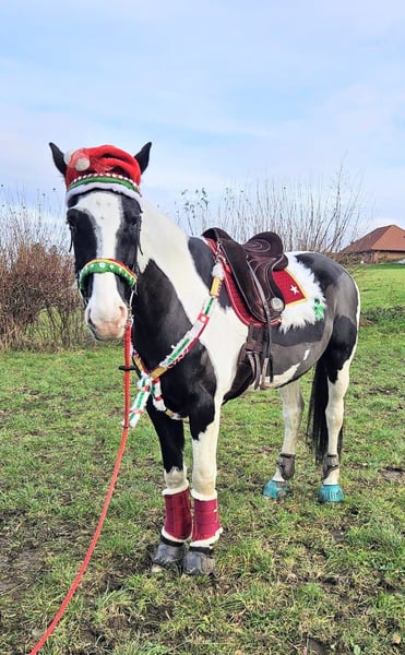 Dyngus (Pablo) - ein 2019 geborener polnischer Sportpferdewallach in der auffälligen und sehr schönen Farbe Rappschecke. Mit einem Stockmaß von etwa 1,70m sowie großrahmigen, harmonischen Gebäude deckt er auch große Reiter gut ab. Er verfügt über eine vollständige Abstammung, ist gesund, PSSM1 n/n getestet und seine kleine Ankaufsuntersuchung vom Juni 2024 war ohne Befund. Aktuell ist er vierfach beschlagen, kann jedoch problemlos auch barhuf gehalten werden. Im täglichen Umgang zeigt sich Dyngus als außergewöhnlich lieber, freundlicher und menschenbezogener Wallach. Er ist ausgeglichen, neugierig, verschmust und lernt sehr schnell. Er verzeiht Reitfehler, lässt sich fein reiten und wird derzeit auch von einer Jugendlichen problemlos geritten. Dyngus ist zudem absolut unkompliziert: Er ist schmiede- und verladefromm sowie brav beim Tierarzt und Hufschmied. In der Herde ist er rangmittig und verträglich mit sowohl Stuten als auch Wallachen. Er lebt im Offenstall bzw. Laufstall und eine artgerechte Haltung mit viel Auslauf und Sozialkontakt wird für ihn weiterhin gewünscht. Unter dem Sattel besitzt er eine solide Grundausbildung. Er geht sicher in allen drei Grundgangarten sowie an der Hand und im Schritt Schenkenweichen / Seitengängen Vorder-/Hinterhandwendung, Rückwärtsrichten etc .Dyngus wird weiterhin gefördert, kennt einige Trail und Working Eqiutation Hindernisse(Brücke, Glockengasse,Tor, Stangenlabyrinth etc) .Er wird Englisch geritten, kennt aber auch den Westernsattel. Er verfügt über viel Geländeerfahrung ( auch in schwierigen + bergigem Gelände). Auch allein ist er souverän unterwegs. Zusätzlich hat er eine zweispännige Fahrausbildung erhalten. Es stellte sich heraus das Kutschefahren nicht seins ist und ihm Stress verursacht. Dies ist auch der EINZIGE Verkaufsgrund, da für die Besitzer aufgrund der eigenen Gesundheit Kutschefahren dem Reiten vorgeht. Ansonsten ist er ein vielseitig einsetzbares, talentiertes Pferd, das bereits an verschiedenen Kursen wie Dressur, Trail oder Working Equitation teilgenommen hat und mit Freude ins Wasser geht. Dyngus ist ein rundum tolles Pferd mit bestem Charakter, schöner Optik und gutem Ausbildungsstand - ein echter Herzenspartner für Menschen, die ein zuverlässiges, lernfreudiges und unkompliziertes Pferd suchen.