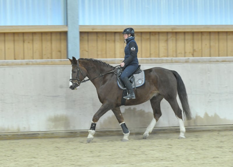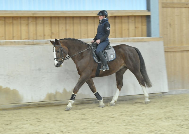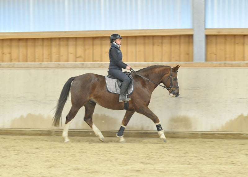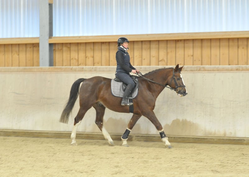 Sehr schicker Dunkelfuchswallach mit ehrlichem Charakter und besten Nerven. Gut zu Sitzen, einfach durchs Genick mit toller Einstellung will er immer alles richtig machen. Er ist ein sehr gut gerittener Wallach mit Doppelveranlagung für Dressur und Springen und ist auch im Gelände ein zuverlässiger Partner alleine oder auch zu mehreren.