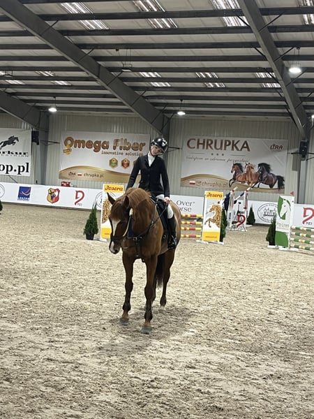 Chestnut Mare from Greater Poland with a Heart for Jumping. Perfect for riders beginning their competition journey. At home, she was ridden by three young riders aged 15, 15, and 17. She is well-behaved with the farrier and veterinarian. Under the care of a physiotherapist. She is gentle in handling, does not bite or kick (she is a sweet mare). Fast, agile, and precise in show jumping. Healthy and injury-free (TUV available for review from January 2024). Jumped at home up to 120 cm. Has competed multiple times in the LL class, often placing and also competed in the L class. Due to her sporting pedigree, she would also be suitable for breeding. It is very important to me that she finds a loving home. Sale due to the desire to pursue further development.