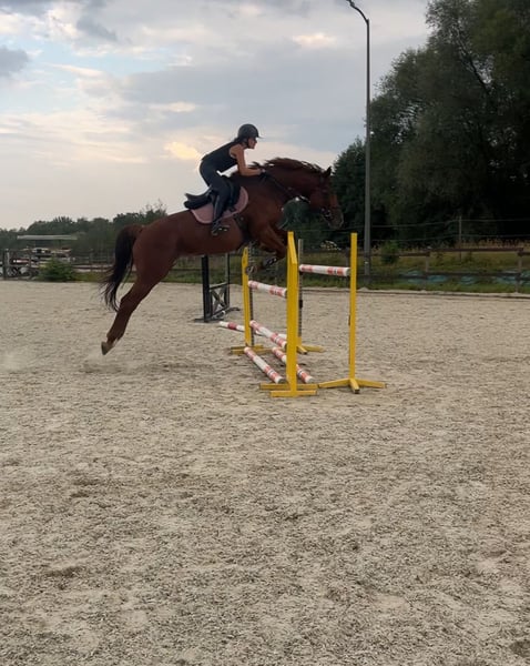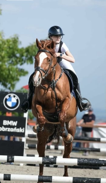 Chestnut mare from Greater Poland with a heart for show jumping. Perfect for riders beginning their competitive journey. At home, she was ridden by three young riders aged 15, 15, and 17. She is well-behaved with the farrier and veterinarian and is under the care of a physiotherapist. She is gentle in handling, does not bite or kick (she is a sweet mare). Quick, agile, and precise in the show jumping arena. Healthy and injury-free (TUV available for review from January 2024). She has been trained at home up to 120 cm. She has competed multiple times in the LL class, often placing in the ribbons, and has also participated in the L class. Due to her athletic pedigree, she would also be suitable for breeding. It is very important to me that she finds a loving home. Sale due to the desire to further develop her potential.