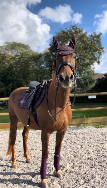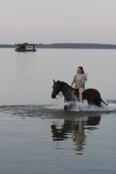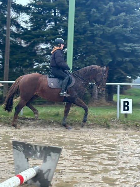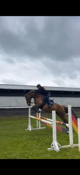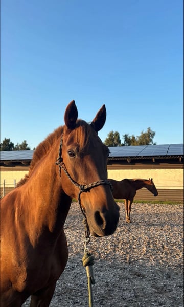Lotte is a 13-year-old, 1.55 m dark chestnut mare with a heart of gold. She is now searching for her new 5-star home through this platform. Currently, Lotte is living in a pasture with a large herd. For her future home, we would prefer her to continue living in an outdoor or active stall environment. Lotte is experienced in riding on the arena, in the indoor hall, and in the field, both in a group and alone. She shows no bad habits or issues in any of these settings. She also enjoys groundwork, lunging, and double-lunging, always demonstrating motivated cooperation. Dressage work is particularly enjoyable for her, and we see her excelling in this discipline in the future (possibly even at competitions). However, Lotte is not limited to dressage; she is also capable of small jumps and rides through water. Despite her gentle and clear-headed nature, Lotte is NOT suitable for beginners and is NOT a children's pony! The mare is generally friendly and well-behaved, but she communicates clearly if something is not to her liking. She has a bit of temperament, which is easily managed by any experienced rider. Loading is usually successful, though it can vary depending on her mood. Additionally, Lotte does not enjoy standing still for the farrier, but this is something that can be trained. She is by no means malicious or aggressive. Lotte also loves to work and is full of energy; she is not intended as a companion or lawn mower. No health issues are known. She will not be sold to dealers or riding school operations. Further photos and videos can be provided upon request. If you have serious questions or are interested, please feel free to contact us.