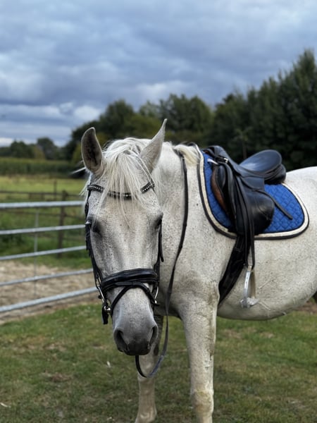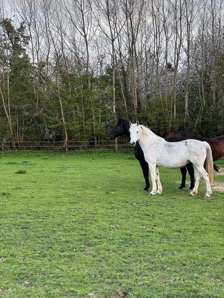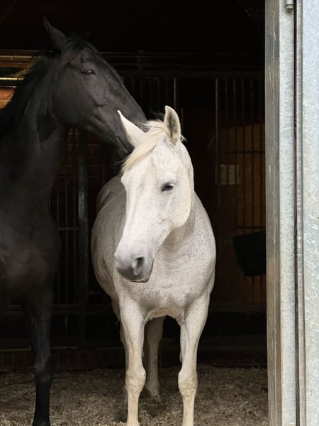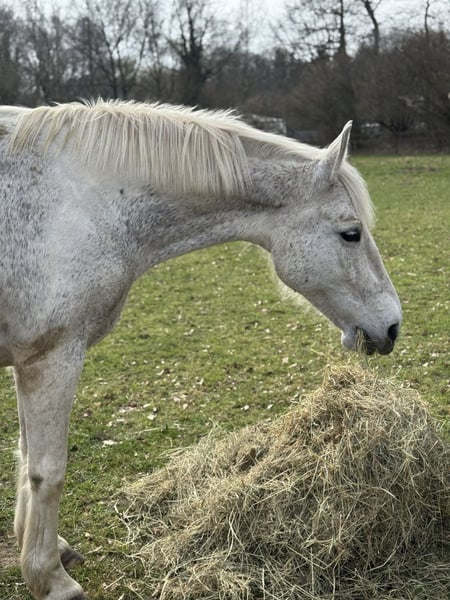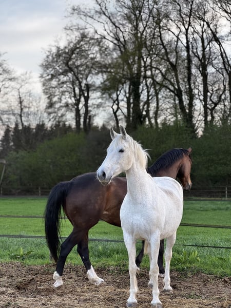 For sale is a strong-charactered gray mare, who is currently in foal and has already successfully given birth to a foal. The Hanoverian Banksy Coeur, to whom she is in foal, has a height of 172 cm, very good gaits, and scored 8.46 in the sport test 2023 and 8.34 in the short eventing test 2022. (Further information in the attachment) The foal is expected to be born in April or May next year. Ivana not only impresses as a reliable breeding mare but also as a faithful leisure horse. Brave, honest, and always motivated, she is ideal for riders looking for a dependable partner by their side. A wonderful horse that captivates with her character and presence, bringing joy in handling. She has good gaits and is very pleasant to ride both in dressage and on trails. Unfortunately, she is blind in one eye and had a mild stroke last year. However, this does not limit her in daily life. Nothing is known about her lineage, but she has complete papers from the Netherlands. Furthermore, she has regularly had her teeth done, is vaccinated, dewormed, and has been regularly shod. The sale is on behalf of the owner, and the price is negotiable. If you are interested or have any questions, please feel free to contact us by phone or WhatsApp at 0177/8870027 :)
