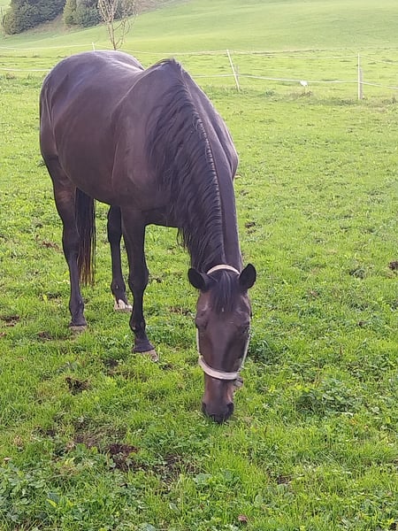 **Sales Advertisement: Versatile Warmblood Mare for Sale** We are offering a rideable companion horse for sale. She is easy to handle, good with the farrier, and veterinarian, and is completely healthy. She can be viewed at any time. **Features:** - **Breed:** Warmblood - **Gender:** Mare - **Year of Birth:** 2015 - **Color:** Black - **Height:** 157 cm