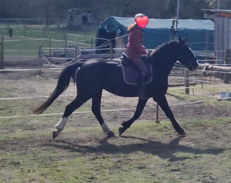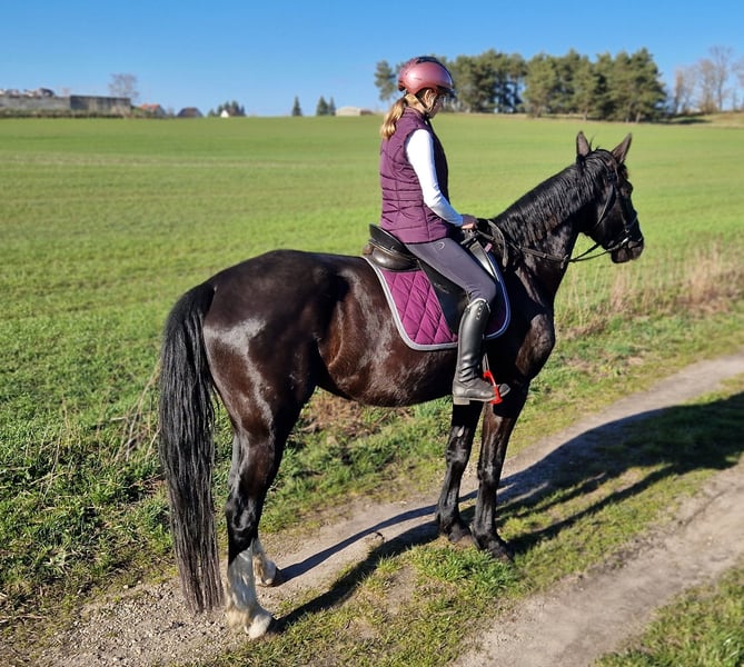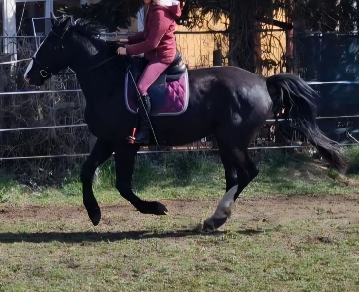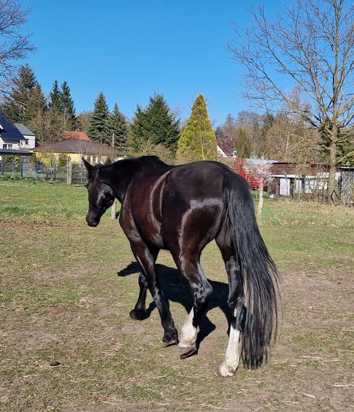 Wunderschöne 5-jährige Rappstute [5/21] mit ausdrucksstarker Bewegung in alle 3 GGA. Absolut unerschrocken und sicher im Gelände sowie im Straßenverkehr. Auch bei der Platzarbeit und am Boden immer fleißig und lernwillig. Herdenverträglich, Verladefromm. Stockmaß zur Zeit 1,71 m.