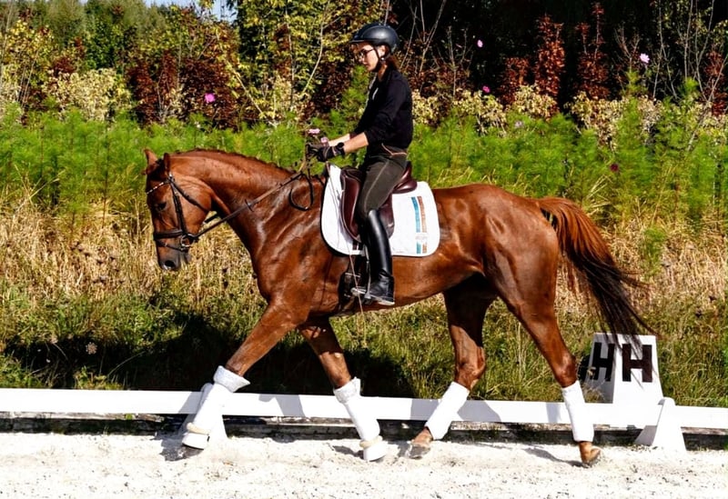 Stute zum Verkauf (8 Jahre); Nachkomme von Empire (Hanover) und Metaxa (Spanier). Sehr auffällig, mit einem wunderschönen dunkel kastanienfarbenen Fell, etwa 1,75 m groß an der Widerristhöhe. Springpferd für Vielseitigkeit, sehr schnelle, wendige und aufmerksame Stute. Gerne springt sie – hat in ihrem Leben noch nie einen Sprung verweigert oder vor einem Hindernis gestoppt. Sehr kontaktfreudig und menschenbezogen. Sie hat ihren eigenen Charakter, ist aber ein äußerst sensibles Pferd, das im täglichen Training konsequente Arbeit und klare Signale benötigt. Sie ist sehr aufmerksam gegenüber dem Reiter, unerschütterlich, bringt im Gelände zuverlässig Futter, und ist äußerst vertrauensvoll. Sie springt alles, verweigert nie und macht es gerne. Seit zwei Jahren in der Ruhephase, aufgrund fehlenden Reiters. Mit Rückkehr in die Arbeit und Steigerung der Fähigkeiten steigt der Preis – momentan 45.000 €. Derzeit im Dressurtraining, da kein Sattel vorhanden ist. Weitere Infos auf Privatnachfrage. *Möglichkeit der Stutenpacht – ohne Eigentumsübertragung – Standort: Heaven, Gestüt Świątniki.