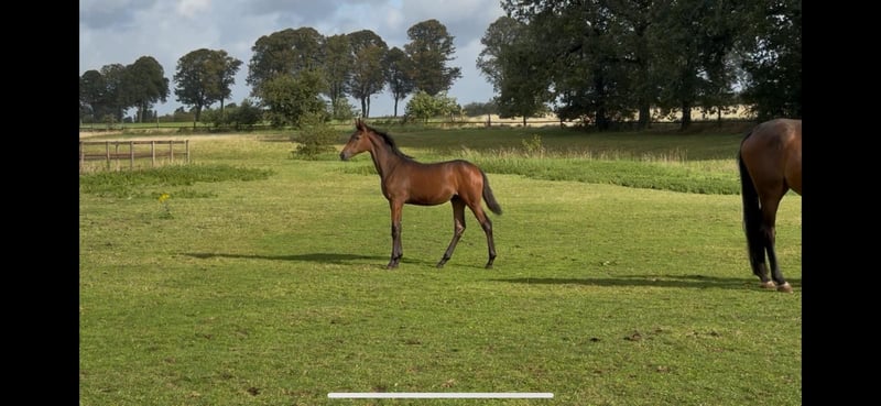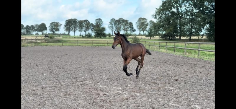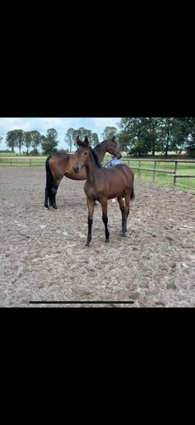 Verkaufe hier unser braunes Stufohlen von Dynamik Pur x Rubin Royal x Sandro Hit. Am 16ten April 2025 wurde die kleine Maus auf unserem eigenen Hof geboren. Im Alltag bei uns zeigt sie sich steht's aufmerksam und neugierig. Ausgezeichnet mit einem sehr edlen Gesicht präsentiert sie sich auf dem Paddock, der Wiese oder in unser Halle gerne. Die Mama bei uns liebevoll "Rita" genannt kümmert sich rührend um die Kleine. Charakterlich zeichnet sich Rita vor allem durch ihre ruhige und gelassene Art aus. Sie lässt sich bei uns gerne von groß und klein betüdeln :) Rita ist 172 cm groß und auch ihre bisherigen Nachkommen bringen eine gute Größe mit sich. Das Stutfohlen wurde in diesem Jahr mit der Goldprämie auf der Fohlenschau ausgezeichnet. Bisher zeichneten sich die Nachkommen von Rita insbesondere durch ihren sehr liebevollen Charakter im Alltag aus. Das Verladen für die Fohlenschau war zum Beispiel mit der kleinen Maus kein Problem :) Auf unserem Hof besteht die Möglichkeit sich Nachkommen aus vergangenen Jahren anzuschauen und uns und unsere Pferde einmal persönlich kennenzulernen :) Leider können wir in diesem Jahr nicht alle Fohlen behalten, sodass wir für die kleine Maus nun das optimale Zuhause suchen. Bei Interesse melden Sie sich gerne bei mir :)