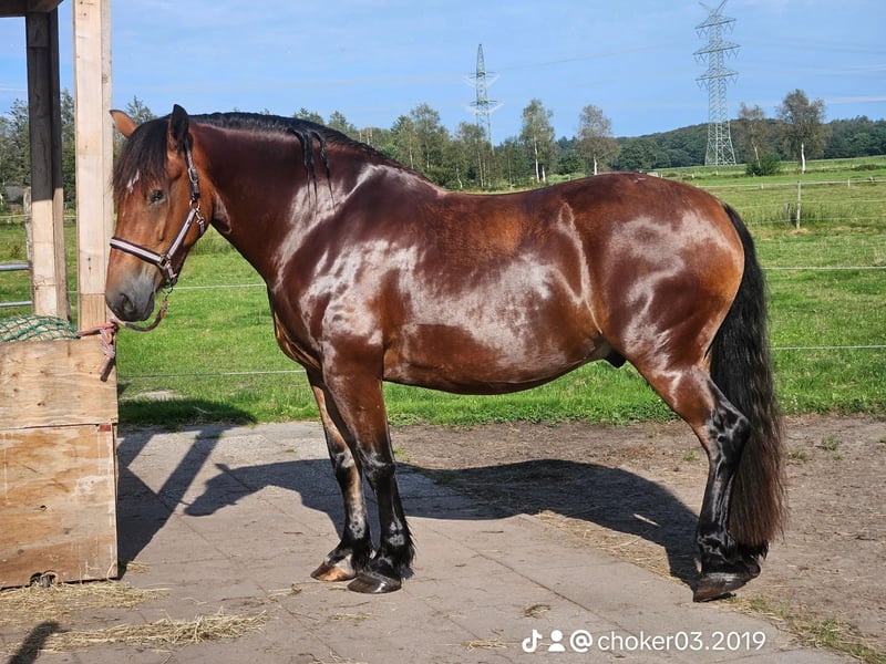 Good day, I am looking for a 5-star home for my big boy. This is certainly not easy and has been in discussion for several months now. Dante (his passport name is Gismo) is a 4-year-old cold-blooded mix with a height of about 1.70m. He knows a lot and has been ridden in all three gaits in the field, both alone and with other horses. Ground work has begun, and he shows motivation here as well. Due to his age, he is not ridden too often, a maximum of 1 to 2 times a week, but rather less, and he is worked a lot from the ground. However, he can also go without being ridden for 3 weeks, and you can easily continue where you left off. My 5-year-old daughter can already ride him on the lunge at a walk and trot. My husband, a complete beginner, has also ridden him freely at a walk and trot, and he has taken him on a walk ride as well. Dante is super intelligent and learns everything quite quickly. I could tell so much about him, but that would exceed the scope here. Dante is good for the farrier and loading, although he is still tense during transport. We don’t travel too often. However, loading works wonderfully on his own, and unloading is also easy without a second person. Dante has been living in an open stable since being weaned; he only knows the box from his castration, but he was very well-behaved there as well. Dante will only go to a home that is absolutely suitable for him; this is not an urgent sale, and he will only go if everything fits!