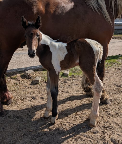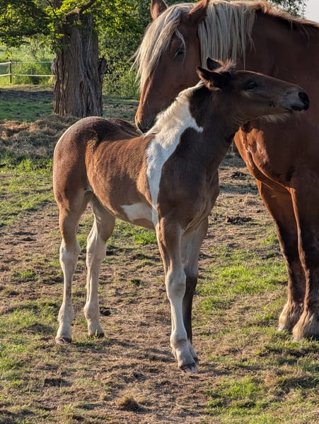 Our lovely Katinka, born on May 4th, 2025, is looking for a caring forever home. With her striking brown and white coat, her sturdy build, and her calm, people-oriented nature, she is truly a heart horse. 💕 Name: Katinka Date of Birth: May 4th, 2025 Gender: Mare Breed: Coldblood Cross (Mother: Comtois, Father: KWPN) Color: Brown and white pinto Approximate Height: 16.1–16.3 hh Temperament: Friendly, curious, balanced, and well-behaved around people Katinka is raised appropriately in an open stable environment within a small herd. She is familiar with halter, grooming, hoof care, and regularly sees the farrier. She is an excellent young horse for leisure riding, driving, or later under saddle.