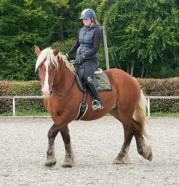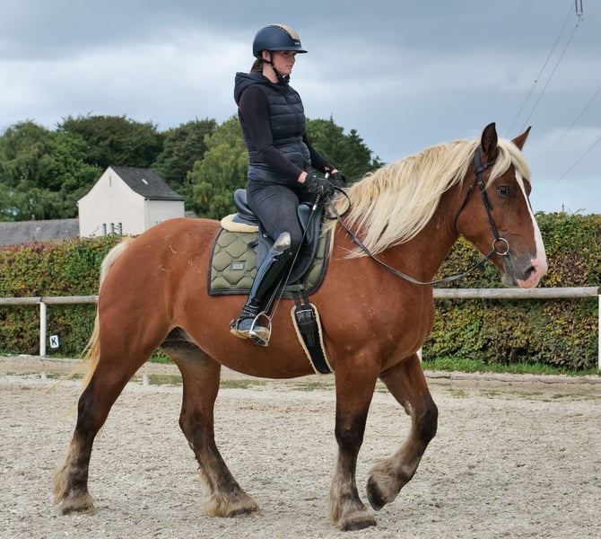 Nom : Mirabell Race : Trait Comtois (Trait de trait léger) Sexe : Jument Date de naissance : 18/04/2022 Âge : 3 ans Taille au garrot : 1,60 m (16.1 hh) Couleur : Alezan clair Origine : Disponible sur demande Caractère : Sociable, calme, patient, curieux, intelligent, courageux, volontaire à l’apprentissage Éducation / Potentiel : Montée, loisirs, dressage, randonnée, cheval de terrain Expérience en terrain : Intrépide, attentive, calme, résiste au stress, aussi bien en solo qu’en groupe Santé : Vermifugée, vaccinée, pieds nus, sans eczéma, dents contrôlées, traitée en ostéopathie Hébergement : Box ou paddock Spécificités : Apprivoisée à la ferrure et au déchargement, compatibilité avec le troupeau, cheval de randonnée, porteur de poids Les caractéristiques mentionnées reposent sur notre appréciation personnelle et ne constituent pas une garantie. Prix : 6 900 € (TVA incluse) Vous souhaitez en savoir plus ? Pour vous donner une meilleure idée de Mirabell, nous serions ravis de vous envoyer sa vidéo de monte. Bien entendu, nous restons disponibles pour une description détaillée du cheval, un conseil personnalisé et pour répondre à toutes vos questions par téléphone. N’hésitez pas à nous envoyer un message WhatsApp à tout moment ou à nous appeler au : +49 15119487595 Nos horaires téléphoniques : tous les jours de 7h00 à 13h30 et à partir de 20h00. Nous serions heureux de votre contact ! Une visite vétérinaire, comprenant un examen clinique ou radiologique, peut être effectuée par le vétérinaire de votre choix. Mirabell peut également être livrée en toute sécurité et confortablement à votre nouveau domicile. Nous nous occupons de toutes les préparations nécessaires et du transport, afin que votre nouveau compagnon arrive sereinement, bien soigné, assuré et en parfaite santé. Actuellement, nous proposons une sélection soigneusement choisie de chevaux à vendre. Avec nous, vous trouverez sûrement votre cheval de rêve. N’hésitez pas à visiter notre site internet : www.marvinsroyalhorses.de. Chers clients, nous serions heureux de vous présenter nos chevaux et de vous permettre de les brosser, seller, longéer, faire du travail à pied ou des essais en carrière, sur le terrain ou en extérieur, afin de mieux connaître votre futur compagnon. Ce service coûte 40 € par cheval, 30 € pour chaque cheval supplémentaire, et sera remboursé lors de l’achat. Notre adresse : Ferdinand Grube 50 53577 Neustadt Wied Google Maps : marvinsroyalhorses