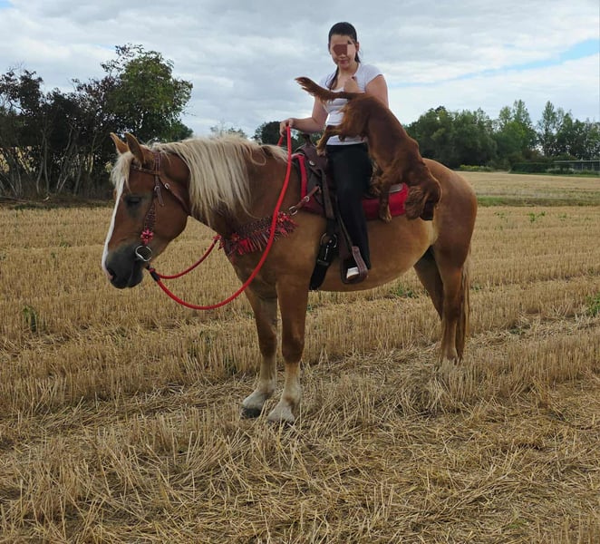 Przepiękny, przyjazny koń rekreacyjny do sprzedaży! 3,5 roku Wysokość w kłębie: ok. 1,58 m Cena: 6 300 zł Wera to urocza, dobrze zbudowana klacz o łagodnym usposobieniu i zrównoważonym charakterze. Zachwyca spokojnym temperamentu i otwartym, przyjaznym dla ludzi charakterem – idealna dla osób poszukujących niezawodnego konia rekreacyjnego z klarownymi nerwami. Niezależnie od tego, czy w terenie, na placu czy podczas codziennego kontaktu: WERA zawsze jest uprzejma i opanowana. Dzięki swojej opanowanej naturze i pewności kroków jest również doskonała na wycieczki konne. ✅ Właściwości NORY: mikroczip i paszport elektroniczny – AKU • Przydatna w terapii • Bardzo spokojna, odważna i klarowna w głowie • Posłuszna podczas codziennej obsługi (czyszczenie, prowadzenie, siodłanie itp.) • Dobrze zbudowana • Aktualne badanie przedzakupowe dostępne! • Świetna na rekreację, dla rodzin – i na wycieczki konne – posiada wszystkie cechy, aby być wiernym partnerem rekreacyjnym Nasze konie – troskliwie pielęgnowane: • Regularnie odrobaczane • Kontrolowane i pielęgnowane przez kowala • W razie potrzeby poddawane osteopatii W naszym sklepie na gospodarstwie znajdziesz używane siodła westernowe, uzdy, ogłowia i wiele więcej. Akcesoria i transport chętnie zorganizujemy dla Ciebie w korzystnej cenie! Nasza oferta dla Ciebie: Abyś mógł podjąć decyzję z pełnym spokojem: • 3 miesiące gwarancji wymiany (umownie ustalone) • Możliwość próbnego przejazdu: → 35 € za pierwszego konia, 25 € za każde kolejne – przy zakupie tego samego dnia odliczane od ceny • Spędzanie czasu z koniem, jazda, spacer lub możliwość jazdy przed koniem • 100 € zniżki przy natychmiastowym odbiorze lub transporcie tego samego dnia • Osobiste wsparcie i szczere doradztwo podczas jazdy próbnej Zainteresowany? Czekamy na Twój telefon!