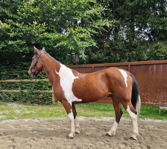 For sale is a beautiful 10-year-old Irish gelding with a height of 155 cm. This stylish pinto with an elegant look not only impresses visually but also with his sweet temperament and strong nerves. He is well-behaved when ridden out, going alone or in a group, and is familiar with beach rides and trail rides, remaining calm and reliable at all times. Fearless and attentive, he is always eager to please his rider – a true heart horse! 💖 He is also familiar with groundwork, although this is still new to him – he consistently shows a willingness to learn and is motivated. He is a 4-gaited horse and a pace horse, making him particularly comfortable to sit on. The canter is also responsive in the field. Healthy, without vices, barefoot, load-friendly, and accustomed to both pasture and box stall living. An all-around great leisure partner for anyone looking for a loyal, uncomplicated, and versatile horse. 💚 A viewing appointment can be arranged at any time upon request, and transport can be organized! His equipment can also be purchased for an additional fee if desired!