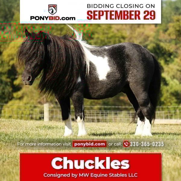 🐴 𝒕𝒉𝒆 𝐅𝐀𝐋𝐋 ℙ𝕆ℕ𝕐 𝑺𝒑𝒆𝒄𝒕𝒂𝒄𝒖𝒍𝒂𝒓🐴 Happening now thru MONDAY | SEPTEMBER 29th - Available EXCLUSIVELY on Ponybid's website! For more details and to register visit: www.Ponybid.com CONSIGNOR CONTACT: MW Equine Stables LLC 330-365-0235 LOCATION: Fresno, OH BREED: Miniature REGISTERED: No COLOR: Black & White HEIGHT: 34" AGE: 9 GENDER: Gelding Chuckles is a 9 year-old black and white mini pony gelding that is absolutely a Gem . He is 34 inches tall. An absolutely amazing pony for beginner kids. He is Stunning and absolutely so much fun. He will walk trot and canter. Very easy to catch in the pasture. He is an absolute dream for the beginner kids. He is more woah than go, and very, very safe. Chuggles is trained to ride and drive. He is traffic safe, we have also taken him out on the trails. And he is amazing. He has that puppy, dog, personality, and is a your pocket Type of pony. Chuckles has also been out working with the cows. And absolutely loves it. He will pour his heart out for his rider. Whatever you ask of him, he will absolutely try his best. You will not find anything safer than Chuckles…..