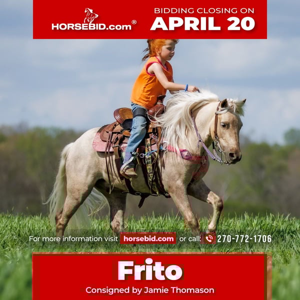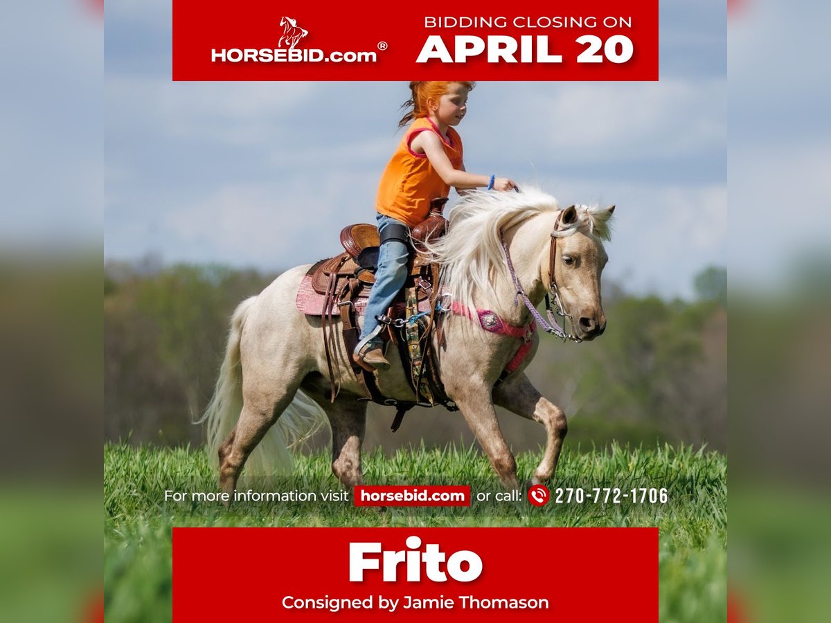 ⚜️𝐭𝐡𝐞 𝓔𝓵𝓲𝓽𝓮 𝐒𝐩𝐫𝐢𝐧𝐠 𝐂𝐥𝐚𝐬𝐬𝐢𝐜⚜️ Happening now thru MONDAY | APRIL 20th - Available EXCLUSIVELY on HorseBid's website! For more details and to register visit: www.Horsebid.com CONSIGNOR CONTACT: Jamie Thomason 270-772-1706 LOCATION: Auburn, KY BREED: Pony REGISTERED: No REGISTERED NAME: FRITO COLOR: Dappled Palomino HEIGHT: 45 inches AGE: 4 GENDER: Gelding The kind of pony kids dream about! Cute, kind, and full of personality, Frito is a 4 yr old, gorgeous dappled palomino gelding, standing 45 inches. The perfect all-around pony! A fun partner for any adventure! Frito rides like a big horse with a true handle, solid training, and a dependable feel. He only goes the speed he asked, has a slow canter, & picks up his leads. Frito is confident on the trail, rides alone or in a group, crosses water, & steps over logs. Frito has sorted cattle and tracks well, showing natural ability and confidence around livestock. He’s also been hauled to the local saddle club, where he’s safety packed kids around the barrels and through fun classes. He’s always a crowd favorite! The kids really enjoy Frito. If we didn’t already have a pony for our son, he would be staying! They are able to do most daily tasks with Frito independently with our instruction. He’s easy to catch & stands for bathing & grooming. The kids can pickup and clean his feet, and even load & unload Frito by themselves. Set your children up for success with Frito—a pony they can grow with, not outgrow. A true friend for years to come. Frito sells current on all care & we can assist in arranging transport to anywhere! If you would like to meet Frito prior to adding him to your family or have additional questions, feel free to reach out!