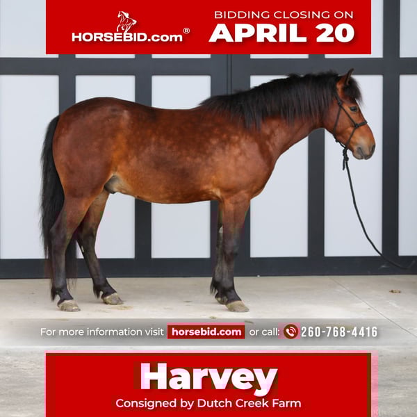 ⚜️𝐭𝐡𝐞 𝓔𝓵𝓲𝓽𝓮 𝐒𝐩𝐫𝐢𝐧𝐠 𝐂𝐥𝐚𝐬𝐬𝐢𝐜⚜️ Happening now thru MONDAY | APRIL 20th - Available EXCLUSIVELY on HorseBid's website! For more details and to register visit: www.Horsebid.com CONSIGNOR CONTACT: Dutch Creek Farm 260-768-4416 LOCATION: Shipshewana, IN BREED: Crossbred Pony REGISTERED: No REGISTERED NAME: Harvey COLOR: Bay HEIGHT: 13.2 AGE: 4 GENDER: Gelding Harvey! Check out this cute little 13.2 hh bay crossbred pony gelding. This little guy is super broke to ride and drive. We had him on our farm for 2 years. He was used in our riding stable all last summer where he had all kinds of kids on his back and was not bothered about all the activity going on. Harvey will also be fun for the experienced little cowboy or girl. He will walk, trot, or lope happily in the arena, picking up the correct lead and moves off your seat and leg cues. This guy has tons of experience. he will be happy to take your kids down the trails over logs, through water, bridges, he will do it all. We have ridden him in english tack and taken him over jumps. Harvey drives just as good and will pull your family down the road or around the farm. He is traffic safe, sound and ready to take your kids to the show ring or just be your safe, reliable kids' first pony.
