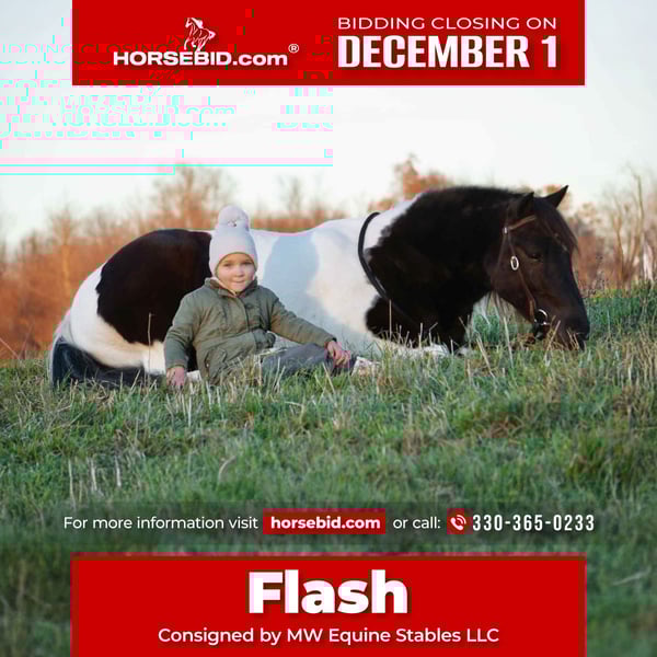 ⚜️ 𝓽𝓱𝓮 𝐇𝐨𝐫𝐬𝐞𝐦𝐚𝐧'𝐬 𝓢𝓱𝓸𝔀𝓬𝓪𝓼𝓮⚜️ Happening now thru MONDAY | DECEMBER 1st - Available EXCLUSIVELY on HorseBid's website! For more details and to register visit: www.Horsebid.com CONSIGNOR CONTACT: MW Equine Stables LLC 330-365-0233 LOCATION: Fresno, OH BREED: Pony REGISTERED: No COLOR: Black & White HEIGHT: 0 AGE: 4 GENDER: Gelding Flash is a 4 yr old pinto pony gelding standing 49 inches tall. He was born and raised here on the farm! Flash is broke broke broke! He has 3 beautiful gaits, walk, trot, canter and moves off of leg cues . Takes both leads and is fun to ride. He isn’t bothered by the bull whip, the tarp, or the ball. He rides English, western, bareback, or bridleless- whichever you prefer ! Flash has also been introduced to jumping and is very willing. He would make a fantastic English riding pony or a western pony . Making the perfect match for every child.. He is great on trail rides and has been on moonlight rides and big group trail rides. He goes out alone, crosses logs, creeks, and more! Flash is as close to perfect as one can get to take for a ride and teach kids the ropes. Flash is safe on the road to ride or drive. He drives the absolute very best and is traffic safe . The kids drove him to school quite a bit last year! If you’re looking for a safe pony that can do anything you’re looking for, this is the one! Don’t miss him. ☑️10 Day - Money Back Guarantee‼️