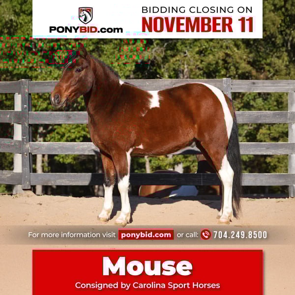 𝓽𝓱𝓮 𝐑𝐈𝐃𝐄𝐑'𝐒 𝓒𝓱𝓸𝓲𝓬𝓮 🐴 𝐏𝐎𝐍𝐘 𝐄𝐃𝐈𝐓𝐈𝐎𝐍 🐴 Happening now thru TUESDAY | NOVEMBER 11th - Available EXCLUSIVELY on Ponybid's website! For more details and to register visit: www.Ponybid.com CONSIGNOR CONTACT: Carolina Sport Horses 704.249.8500 LOCATION: Clover SC BREED: Paint pony REGISTERED: No COLOR: Paint HEIGHT: 12.2 AGE: 5 GENDER: Gelding Meet Mouse - A pint size superstar who does big things in both the saddle and harness. This 12.2 hand paint Goin is tailored for young riders, pony club, 4-H adventures, and family, friendly fun. Five years old he’s already proven himself to be reliable, talented, and playful - And ready for his best years ahead. Mouse doesn’t just ride, he also drives. He handles a buggy with confidence and ease, making him ideal for kids who won’t to explore both saddle and carriage riding. He’s also happy to haul adults around in his buggy. He is kid friendly, and he’s been primarily ridden by younger writers, he’s safe, kind, and attentive. He’s the first horse to meet you in the pasture and if you have ponies, you know that’s a rare thing to say. He’s not the grumpy old lesson pony he’s a friend just wanting to have his partner. Mouse is the perfect size for growing riders. At 12.2 hands, he’s the right height to help build confidence while still being sporty and responsive. Mouse delivers versatility that many ponies only promise. If you’re looking for a pony that can keep up with riding and driving, provide safe and fun experiences for kids, and feel like a true companion - Mouse Checks every box. He’s not just cute, he’s capable. He’s not just safe - He’s fun! He’s the kind of partner that helps young riders grow, explore, show and shine!