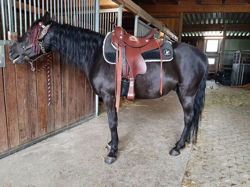 Filou (Smokey Black Label) ist ein bildhübscher, reinrassiger Rappe mit einem Stockmaß von 1,45 m. Er ist gesund und geimpft gegen Tetanus und das West-Nil-Virus (gegen Influenza das letzte Mal im Mai 2024), wird 3x im Jahr entwurmt und seine Hufe regelmäßig alle 7 Wochen von einem Schmied bearbeitet (schmiedefromm). Seine Zähne werden 2x im Jahr kontrolliert. Er lebt momentan in einem Offenstall (mit einem Wallach und einer Stute), im Sommer mit Weidegang und sollte so artgerecht auch weiter gehalten werden. In eine überwiegende Boxenhaltung soll er keinesfalls gegeben werden. Gutes Heu und Stroh verträgt er. Filou ist angeritten, eingeritten mit 4 Jahren und in den letzten Monaten wurde er hauptsächlich vom Boden aus gearbeitet. Unter dem Sattel zeigte er bereits den Foxtrott, der noch weiter gefördert werden sollte. Der Flatwood Walk wurde bisher nicht trainiert. Trab zeigt er besonders gut, wenn er beispielsweise beim Longieren auch über Stangen geht, da er sonst noch gerne im Pass laufen möchte. Die Doppellonge kennt er auch. Filou ist menschenbezogen, neugierig, lernt gerne und mag es, wenn man sich mit ihm beschäftigt. An seinem Sicherheitsgefühl und Vertrauen zum Menschen sollte noch gearbeitet werden. Als Fohlen wurde er schon im Pferdeanhänger mit seiner Mutter an das Fahren gewöhnt und ist absolut verladefromm, sowohl im 2-er als auch im 4-er Hänger mit diagonaler Position und Frontausstieg. Durch Trennung und eventuellem Hofverkauf kann ich dem Pferd leider nicht mehr gerecht werden und wünsche mir ausdrücklich eine/n erfahrene/n Reiter/in/, die/den die Aufgabe der weiteren Ausbildung Filous reizt und der / die sich viel Zeit und Ruhe für ihn nehmen möchte.
