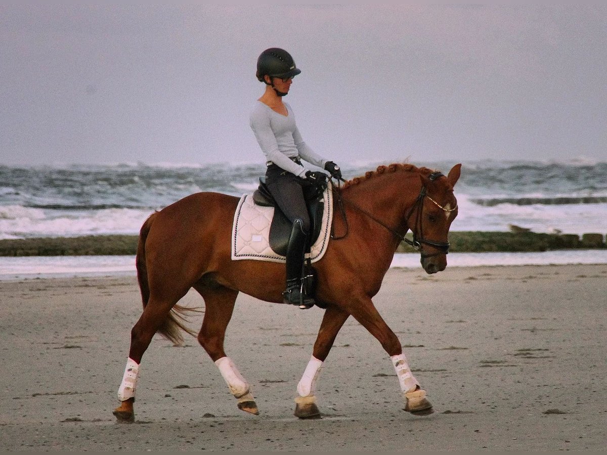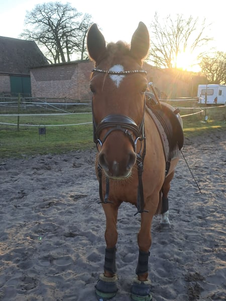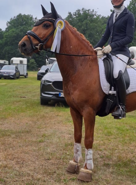 Pinot Noir - bei uns "Pino" - ist ein wunderschöner Ponywallach mit viel Charme und einem Herz aus Gold. Er ist 2020 geboren und ist aktuell 1,45m groß und bleibt damit auch sicher im Maß. Er hat 3 gute Grundgangarten, wobei besonders sein bergaufgesprungener Galopp hervorzuheben ist. Pino wurde von mir als Amateur 4 jährig schonend angeritten und bisher vor allem Dressurmäßig gefördert. Letztes Jahr konnte er sich mehrfach in A* und A** Dressur vorne platzieren - mit Noten bis 8,0. Ich habe ihn diese Saison auch schon in L* vorgestellt. Er ist ein liebes Pony, welches sich immer bemüht die Hilfen des Reiters richtig umzusetzen. Er läuft in der Abteilung problemlos vorne und hinten und kennt es auch mit Ausbindern geritten zu werden. Er ist allerdings nicht Anfänger geeignet und benötigt einen ruhigen Reiter, der einen gefestigten Sitz hat (so Dressurreiter-WB Niveau). Ich kann ihn mir durchaus auch für ein sicher reitendes Kind vorstellen mit entsprechender Hilfe. Ebenso wäre er natürlich auch für kleine Erwachsene geeignet. Weiteres dazu gerne im persönlichen Gespräch. Er geht inzwischen - auch alleine - super artig ins Gelände. Weiterhin war ich mit ihm letztes Jahr auch am Strand auf Norderney, wo er sogar erfolgreich Turnierprüfung gelaufen ist. Im Springen wurde er bisher noch nicht weit gefördert, er kennt Stangenarbeit und Cavalettis und kleine Kreuze, dies absolviert er zuverlässig. Im Umgang ist er ein absoluter Schatz, sehr liebenswürdig und absolut artig und unkompliziert. Er ist schmiedefromm (aktuell vorne beschlagen) und verladefromm (geht alleine auf den Anhänger). Ich kann ihn mir daher sehr gut für jemanden vorstellen, der in den Turniersport einsteigen möchte, da er super unkompliziert und brav auf Turnier ist, auf dem Anhänger steht wie ne Eins und sich super Verladen lässt etc. Er klebt nicht und kennt es auch alleine zu bleiben. Aktuell steht er nachts in der Box und tagsüber den ganzen Tag draußen, ich könnte mir ihn ebenso aber auch im Offenstall vorstellen. Bei mir steht er in Wallachgesellschaft und zeigt sich hier sehr sozial, rangniedrig und verspielt. Er ist natürlich regelmäßig geimpft und entwurmt und Zähne wurden gemacht. Bei mir war er immer gesund und zeigt sich sehr robust. Er steht korrekt auf den Beinen und hat ein gutes, stabiles Fundament. Ich gebe dieses absolute Traumpony nur in allerbeste Hände! Ich habe keinen Verkaufsdruck und wünsche mir ein tolles - am liebsten Für immer-Zuhause mit guter Haltung für Pino, wo er weiterhin gefördert, geliebt und wertgeschätzt wird. Platz vor Preis! Sein Zubehör (Passier Sattel, Trense, vers. Horseware Decken) kann bei Interesse gerne mitübernommen werden.