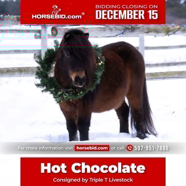 🎄𝐓𝐇𝐄 𝑯𝒐𝒍𝒊𝒅𝒂𝒚 𝐂𝐋𝐀𝐒𝐒𝐈𝐂🎄 Happening now thru MONDAY | DECEMBER 15th - Available EXCLUSIVELY on HorseBid's website! For more details and to register visit: www.Horsebid.com CONSIGNOR CONTACT: Triple T Livestock 507-951-7880 LOCATION: Nevis, MN BREED: Pony REGISTERED: Yes REGISTERED NAME: Hot Chocolate COLOR: Bay HEIGHT: 38inches AGE: 5 GENDER: Gelding ⸻ Here’s the kind of pony every family searches for — one that is truly gentle, safe, and dependable for kids, yet broke and handy enough to step up and help with real jobs. This little gelding has a kind heart and a steady way of going that puts young riders instantly at ease. He’s patient, forgiving, and stays quiet no matter the setting, making him a confidence-builder for any child. What makes him stand out is that he doesn’t just babysit — he participates. Whether a kid wants to help with chores, push livestock, or just have fun in the arena, he stays willing, calm, and completely trustworthy. He takes new tasks in stride and allows young riders to feel like they’re really part of the action, all while keeping them safe and comfortable in the saddle. In the arena, he guides easily, responds softly, and feels like a broke horse underneath a child. He moves willingly, stops when asked, and listens with a quiet, honest disposition. He’s the perfect teacher for kids learning to ride correctly, yet he’s uncomplicated enough for beginners who are still gaining balance and confidence. Outside or in busy environments, he remains solid and steady. He’s been hauled, used around livestock, and ridden by kids in a variety of settings without ever giving them a reason to worry. This is the pony that makes memories — the one children learn on, laugh on, and grow on. If you want a pony that is truly safe, easy to get along with, and handy enough for ranch chores or play days, this little guy fits the bill in every way.