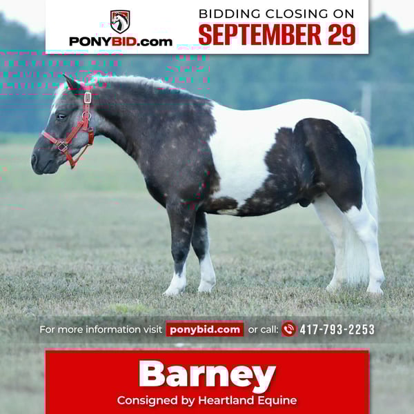 🐴 𝒕𝒉𝒆 𝐅𝐀𝐋𝐋 ℙ𝕆ℕ𝕐 𝑺𝒑𝒆𝒄𝒕𝒂𝒄𝒖𝒍𝒂𝒓🐴 Happening now thru MONDAY | SEPTEMBER 29th - Available EXCLUSIVELY on Ponybid's website! For more details and to register visit: www.Ponybid.com CONSIGNOR CONTACT: Heartland Equine 417-793-2253 LOCATION: Mt Vernon MO BREED: Pony REGISTERED: No COLOR: Paint HEIGHT: 39” AGE: 6 GENDER: Gelding Did you know unicorns come in small sizes? Here is a rare opportunity to bring one home for your kids! Barney is a 5 year old paint gelding. This gorgeous little paint, stands 39” tall. He is absolutely adorable with an amazing personality to match! Barney is extremely broke and ready to teach your kiddos to ride. Point and go kind of guy, Barney will only go as fast as his rider asks. He has been rode by kids and does everything on him! This little guy has seen all the flapping tarps, bouncing balls, water, traffic- you name it. From cruising down the trails to plopping around the arena, Barney is always ready for whatever is thrown his way. Kid tested, mother approved. This handsome little guy is also broke to drive! He is good to harness & hook. Barney is SO fun to take for a cruise, he has been to town & is traffic safe. The total package! Barney loves people, he is easy to catch and very friendly. No kick, bite or nonsense. Your kids will easily be able to handle him alone. Barney stands like a perfect gentleman to be groomed, saddled and mounted. They can groom him for hours, climb all over him- Barney is a kids horse through and through! Leads, loads, ties like a good horse should. Good for the farrier with excellent feet. Barney is ready to move into your barn and be a part of your family!