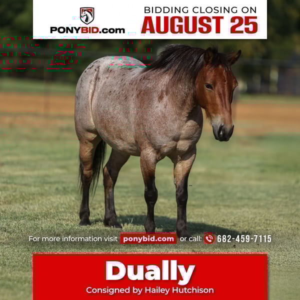 ✨ 𝐀𝐔𝐆𝐔𝐒𝐓 𝓐𝓵𝓵 𝓢𝓽𝓪𝓻 𝑷𝑶𝑵𝒀 𝓛𝓲𝓷𝓮𝓾𝓹 ✨ Happening now thru MONDAY | AUGUST 25th - Available EXCLUSIVELY on PonyBid's website! For more details and to register visit: www.Ponybid.com CONSIGNOR CONTACT: Hailey Hutchison 682-459-7115 LOCATION: Joshua TX BREED: Pony REGISTERED: No REGISTERED NAME: Dually COLOR: Bay Roan HEIGHT: 11 AGE: 8 GENDER: Gelding Dually is a replica of your favorite truck just in a smaller and cuter package! ♥️✨🙌🏻 Handsome bay roan gelding, that is 8 years old, and stands 11 hands tall. Dependable, durable, safe, gentle gentle, and EXTRA cute he is!! Dually doesn’t know how little he truly is, but that doesn’t stop from taking on any job a big horse can do, and will keep right up with the best of them! WTL steady circles in the arena, picks up both leads easily, and has a good stop. One hand neck rein, and will go absolutely anywhere he’s pointed to! Has enough buttons for the older kids, or will go just as slow and steady for the little ones! Quiet and unbothered in busy atmospheres- he is the star of the show wherever you take him and loves all the attention! Crosses the tarp, carries the flag, get the mail, or take to the drive thru! Gather cattle on him, hike up and down your roughest trail, swimming in the pond, crosses logs/brush, he will happily do it all! 🌄 Easy to catch, handle, tack up, and bathe. Quiet and easy going dispostion, friendly personality, and the easiest pony to love! Loads/ hauls good- gets along with other horses. Dually isn’t your average pony, and one you will enjoy having around! Please call to visit about Dually! 📲 682-459-7115 🩺Up to date on coggins, deworming, and farrier.