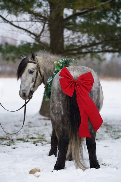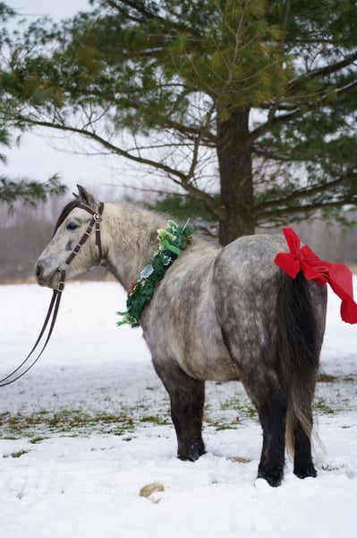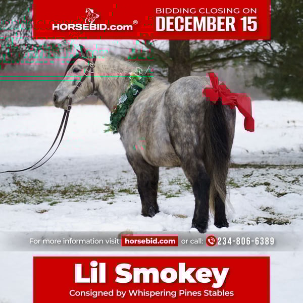 🎄𝐓𝐇𝐄 𝑯𝒐𝒍𝒊𝒅𝒂𝒚 𝐂𝐋𝐀𝐒𝐒𝐈𝐂🎄 Happening now thru MONDAY | DECEMBER 15th - Available EXCLUSIVELY on HorseBid's website! For more details and to register visit: www.Horsebid.com CONSIGNOR CONTACT: Whispering Pines Stables 234-806-6389 LOCATION: Bristolville OH BREED: Pony REGISTERED: No REGISTERED NAME: Smokey COLOR: Dapple gray HEIGHT: 45 in AGE: 7 GENDER: Gelding Meet Smokey!!! Wow!!! What a beautiful dapple gray color this 45 inch 7 yr old gelding has!! The most incredible pony we have ever had in our barn! From his gentle kind spirit to his sweet temperament, he is any child’s dream come true! He is the perfect pony to be around! He is extremely well broke and will take care of any rider on his back, he is for the well seasoned riders, as well as beginners! He has been an awesome pony for beginners to learn the ropes of riding on our farm and has been an absolute favorite!! He was always the first pick that the children wanted to ride!! he is steady, quiet, dependable, and has a gentle confidence that all riders love! Smokey is a very versatile pony! He rides western and enjoys going after a cow, he would make a cool little ranch pony! He would also look beautiful under English saddle! He has been on trails, through the creeks, over the logs, and he loves every bit of it! he will hitch very nicely to a cart and will stand to hitch until you are completely done , Then he will take you for a wonderful ride on beautiful sunny days, or on a snowy winter day hitch him up to the sled and he will help you make many family memories in the snow! When using him for pony rides at festivals or events, he has been an absolute favorite to all the children, and he was always a true gentleman and took care of his riders. I can’t say enough about this great trustworthy pony! He is a family pony and will be great for any age!! It was a hard decision to offer him up for a new home! If our daughter wouldn’t already have her personal pony, he would be staying on our farm! He will walk , trot,canter and go through obstacles without a fuss. Great manners in the barn, will stand to saddle, harness, etc. he will trailer well and picks up his feet, Just broke ,broke ,broke!!! He will be a great addition to any family!! If you want any more info don’t hesitate to contact me at 234 806 6389