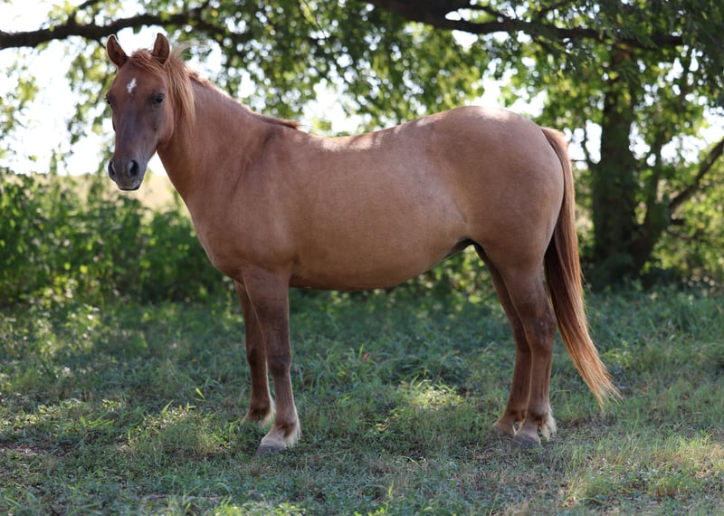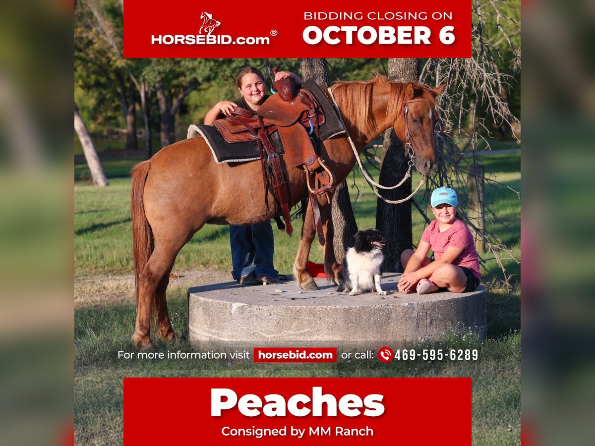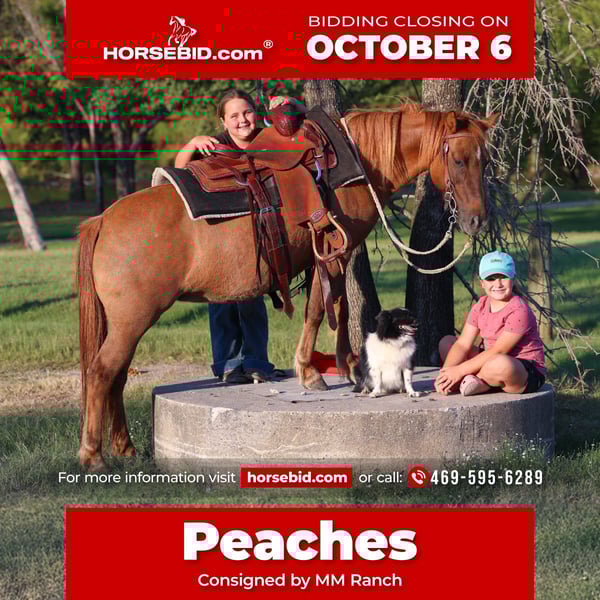 🍂 𝓐𝓾𝓽𝓾𝓶𝓷 𝑨𝑳𝑳 𝑺𝑻𝑨𝑹 𝑳𝑰𝑵𝑬𝑼𝑷 🍂 Happening now thru MONDAY | OCTOBER 6th - Available EXCLUSIVELY on HorseBid's website! For more details and to register visit: www.Horsebid.com CONSIGNOR CONTACT: MM Ranch 469-595-6289 LOCATION: Forney, TX BREED: Pony REGISTERED: No COLOR: Red Dunn HEIGHT: 11.3 AGE: 8 GENDER: Mare 🍑 Peaches 🍑 is a ALL AROUND BOMBPROOF KID PONY. At just 8 yrs old she will last years to come. She is the perfect size well built very pretty red line back Dunn pony. She is the perfect size standing 11.3 hands tall. Stout enough to carry a small adult easily. She is a very safe and trustworthy pony. Anyone that can sit on her can ride her. She rides english or western. She has been rode many many miles up and down the road by traffic, other animals, and lots of noise. She is a been there done that type pony. She is a great well behaved pony no matter what she is doing in or out of the arena. She has done everything from playdays, to team shorting, english jumping, being used on a big ranch to work cattle, being used in lessons, to be ridden in parades, being rode on big trail rides, and to much more to list. She would be perfect for a beginner wanting to learn how to ride or starting showing. Even if a kid has never rode before they can get on and ride her with no problems. She will not get hyper, she’s not buddy soured, she is low headed, very pretty mover, neck reins perfect, backs, has the smooth trot, has a rocking chair lope, rides alone great or in a group, she rides bareback. You WILL NOT FIND A SWEETER NATURED PONY. She has NO BAD HABITS, will not buck, will not kick, will not bite, will not rare up or run off. You do not have to worry about your kids when they are on her. The kids can climb all over her, slide off behind her, crawl under her, stand up on her back, and she will never move a muscle. You do not have to warm her up even if you have went months with out riding her. She is a very easy keeper, gets along get with other horses, loads and hauls great, stands for the farrier. Absolutely 100% sound, good feet, no health problems.