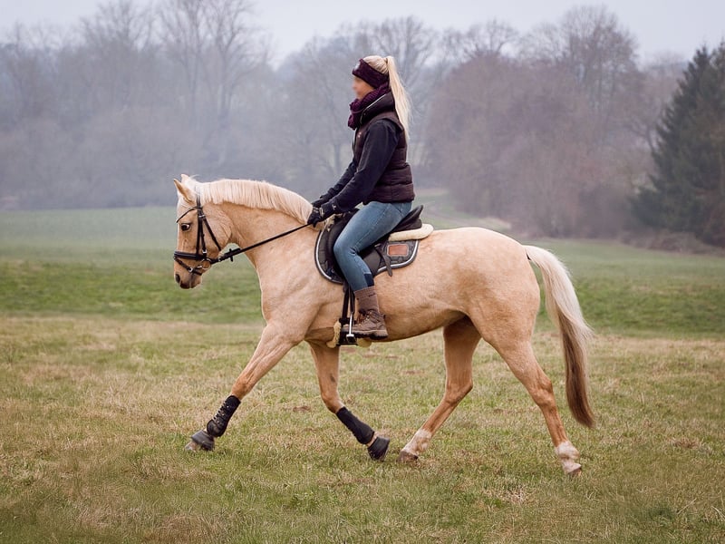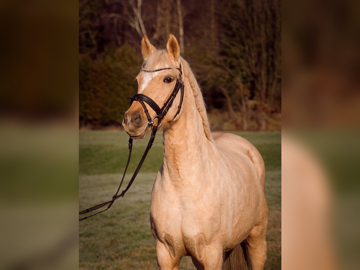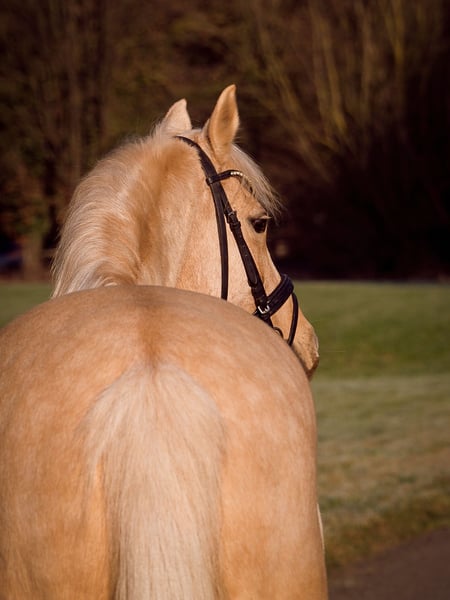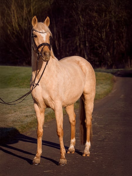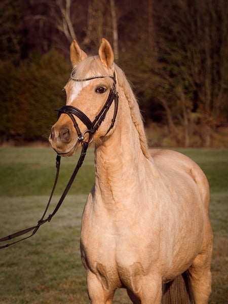 Aufgrund persönlicher Umstände sucht diese wunderschöne Palominostute aus Privathand ein neues Zuhause. Absolut Kinder & Anfängererprobt, auch perfekt für ängstliche Personen. Zu den Fakten: Komplette Abstammung, 1,46m (deckt auch gut Erwachsene ab), 2015 geb., vorn beschlagen, schmiede.- & verladefromm, keine Unarten, Einschränkungen oder Krankheiten. Geimpft, entwurmt, Zähne gemacht und osteopathisch durchgecheckt ohne Auffälligkeiten. Kennt alle Haltungsformen und kommt überall zurecht. E-Zaunsicher. Eher rangniedrig, verteidigt jedoch ihr Futter. Robustes Pony ohne Wehwehchen. Dem Menschen sehr zugewandt, lässt sich gern stundenlang betüddeln. Sehr verschmust. Top erzogen. Geht perfekt an der Longe. Auch mit Reiter, hört aufs Wort und Körpersprache, auch ansonsten sehr aufmerksam bei sämtlicher Bodenarbeit. Den Strick kann man beruhigt jedem Kleinkind geben. Hängt immer durch. Steht still beim fertigmachen. Kennt Dressur.-, Spring.-,Fell.-, & Westernsattel. Auch ohne Sattel oder nur mit Halsring ist kein Problem. Eher gemütlich beim Reiten, verzeiht alle Reiterfehler und ist von absolut jedem Anfänger zu reiten. Läuft in der Halle, auf dem Platz oder im Gelände gleichermaßen. Im Gelände ist sie allerdings wach. Springt brav kleinen Parcours bis A, auch Geländehindernisse, kennt Stangenarbeit allgemein. Dressurmäßig würde ich auch ein A Niveau schätzen. Sie ist bisher nicht auf Turnieren vorgestellt worden. Geht allein oder in der Gruppe raus, verkehrssicher. Ich kann sie mir eigentlich überall gut vorstellen: bei Kindern, in einer Familie, bei einer Einzelperson, bei einem sportlich ambitionierten Reiter oder sogar im Reitbetrieb. Sie freut sich über alles und jeden, ist überall zufrieden und unkompliziert. Kann problemlos auch über einen längeren Zeitraum mal komplett stehen. Man merkt keinen Unterschied im Wesen oder Temperament. Wer wirklich Interesse hat dem kann ich gern ein Video zukommen lassen. Über eine nette Nachricht mit ein paar Zeilen zu euch würde ich mich freuen.