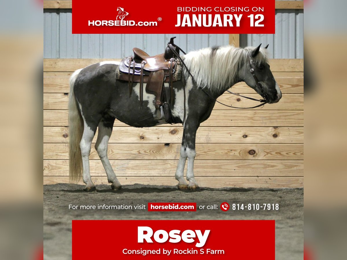 ♦️𝐍𝐄𝐖 𝐘𝐄𝐀𝐑'𝐒 𝑬𝒙𝒕𝒓𝒂𝒗𝒂𝒈𝒂𝒏𝒛𝒂♦️ Happening now thru MONDAY | JANUARY 12th - Available EXCLUSIVELY on HorseBid's website! For more details and to register visit: www.Horsebid.com CONSIGNOR CONTACT: Rockin S Farm 814-810-7918 LOCATION: Rebersburg, PA BREED: Pony REGISTERED: No REGISTERED NAME: Rosey COLOR: Gray and white paint HEIGHT: 12.1 AGE: 12 GENDER: Mare Rosey is a 12 year old paint pony mare. She stands 12:1 hands tall and is the perfect size for all the kids! Rosey has been there and done that . She has proven herself time and time again as a babysitter and is looking for her next best friend! Rosey will respond to leg pressure. She will walk, trot and canter she is well built and well broke to ride, she will walk over the tarp, carry the flag, and go through water. She will go through any obstacle course over the block and logs! Rosey will load, lead and tie. She has been on lots of trail rides through the woods and around the farm and always takes care of her rider ! Rosey will also drive, she is easy to harness and hook up for the kids and listens very well. She handles all the distractions on the road and in her surroundings very well! Rosey is the ultimate kid pony and is definitely a farm favorite for the little ones! She loves to be brushed and braided by the kids and will stand still for it all! Don’t miss out on this very lovable, gentle, and gorgeous pony!! 100% sound and healthy with no bad habits. Rosey has a current coggins and health certificate and up to date on all farrier, dental, and dewormer. We can help arrange shipping anywhere in the United States. Feel free to contact us for any questions you have, Sam 814-810-7918