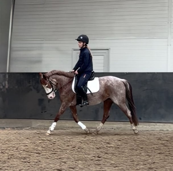 Wunderschönes Sportpony in seltener Farbe Red Roan mit blauen Augen! Zum Verkauf steht eine außergewöhnlich typvolle Sportponystute in der seltenen Farbe Red Roan mit wunderschöner Blesse, vier weißen Beinen und auffällig blauen Augen. Ein absoluter Blickfang mit Sportqualität. „Holde Maid“ ist 6-jährig, mit 1,41 m eingemessen und wurde schonend sowie altersgerecht ausgebildet und startet nun in ihre erste Turniersaison. Sie überzeugt durch ihre sehr guten Grundgangarten, ihre erkennbare Springveranlagung sowie ihre angenehme Rittigkeit. Sie zeigt sich sowohl im Springen, in der Dressurarbeit, im Gelände sowie auf fremden Plätzen stets nervenstark und unkompliziert. Dadurch ist sie sowohl für ein Kind oder ambitionierten Nachwuchsreiter als auch für einen kleineren Erwachsenen interessant. ✔ schmiedefromm ✔ verladefromm ✔ herdenverträglich ✔ klar im Kopf und leistungsbereit Ein vielseitiges Nachwuchspony mit Qualität, das nun den passenden Reiter sucht.