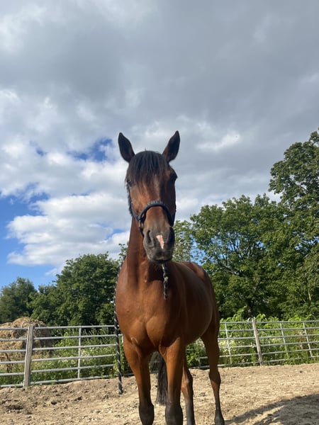 Ein Freizeitpartner mit viel Herz sucht ein liebevolles Zuhause für immer. Herbie ist ein 13-jähriger Traber-Wallach mit einem Stockmaß von ca. 165 cm. Ich habe ihn seit 4 Jahren, Privat hat sich jedoch einiges Geändert weshalb ich ihn leider abgeben muss. Er wird nur in beste Hände abgegeben !, ich wünsche mir für ihn einen Menschen, der ihn als zuverlässigen Freizeitpartner schätzt und ihm viel Aufmerksamkeit schenkt. Herbie steht momentan nicht 100% im Training, was bei regelmäßiger Arbeit jedoch problemlos wieder aufgebaut werden kann. Er kennt Longieren, Bodenarbeit, Reitplatz/Reithallenarbeit, Traktoren sowie entspannte Ausritte und schlittenfahren im Winter. Er ist Geländesicher sowohl alleine als auch in der Gruppe. Auch ohne Sattel lässt er sich reiten sowohl auf dem Platz als auch im Gelände. Unter dem Sattel ist Herbie kein typisches Anfängerpferd, da er einen konsequenten Reiter mit etwas Erfahrung benötigt. Im Umgang hingegen ist er ein echter Schatz: brav, ruhig, freundlich. Herbie versucht es einem immer Recht zumachen und zu gefallen. Er ist sehr lernwillig und lernt neue Dinge schnell und beherrscht den Spanischen Schritt vom boden aus aber auch noch viele weiter Tricks. Herbie sucht einen Menschen, der Lust auf Ausritte, Bodenarbeit und der mit seinem Pferd Spaß haben will. Er wird ausschließlich als Freizeitpferd abgegeben und nicht für den sportlichen Einsatz. Er wird mit Zubehör abgeben. Platz vor Preis! Wenn ihr Herbie kennenlernen wollt oder fragen habt dann schreibt mir einfach :)