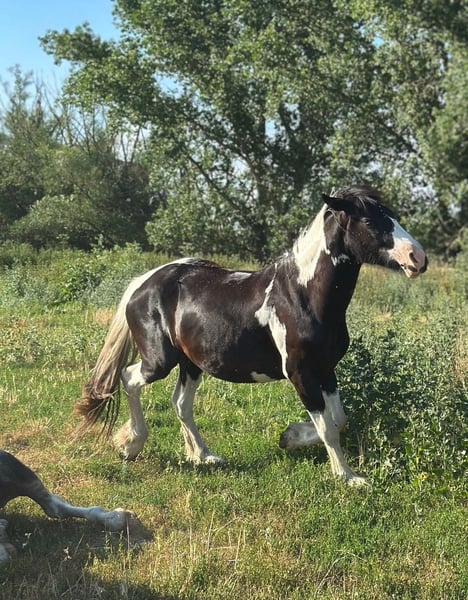 Schweren Herzens steht dieses beeindruckende Drum Horse, geboren im Jahr 2022, zum Verkauf. Mit seinen 4 Jahren befindet es sich in einem idealen Alter, um weiter gefördert zu werden und eine enge Bindung zu seinem neuen Besitzer aufzubauen. Dieses besondere Pferd begeistert nicht nur durch seine imposante Erscheinung, sondern vor allem durch seinen ausgeglichenen, freundlichen und lernwilligen Charakter. Es wurde frisch und solide zum Kutschpferd ausgebildet und zeigt sich dabei zuverlässig, aufmerksam und absolut nervenstark im Geschirr. Auch unter dem Sattel macht es eine sehr gute Figur: Es kennt die Grundlagen, arbeitet motiviert mit und entwickelt sich stetig weiter. Ein echtes Nachwuchspferd mit viel Potenzial – sowohl für den Fahr- als auch für den Reitsport. Abgegeben wird inklusive Zubehör, darunter ein Westernsattel sowie ein einspänniges Kutschgeschirr. Passende Kutschen stehen ebenfalls zum Verkauf und können bei Interesse zusätzlich erworben werden. Wichtig ist mir, dass dieses besondere Pferd in gute und passende Hände kommt. Daher möchten ich vor dem endgültigen Verkauf gerne den neuen Stall bzw. das zukünftige Zuhause kennenlernen. Bei ernsthaftem Interesse freuen wir uns über eine Nachricht und ein persönliches Kennenlernen.
